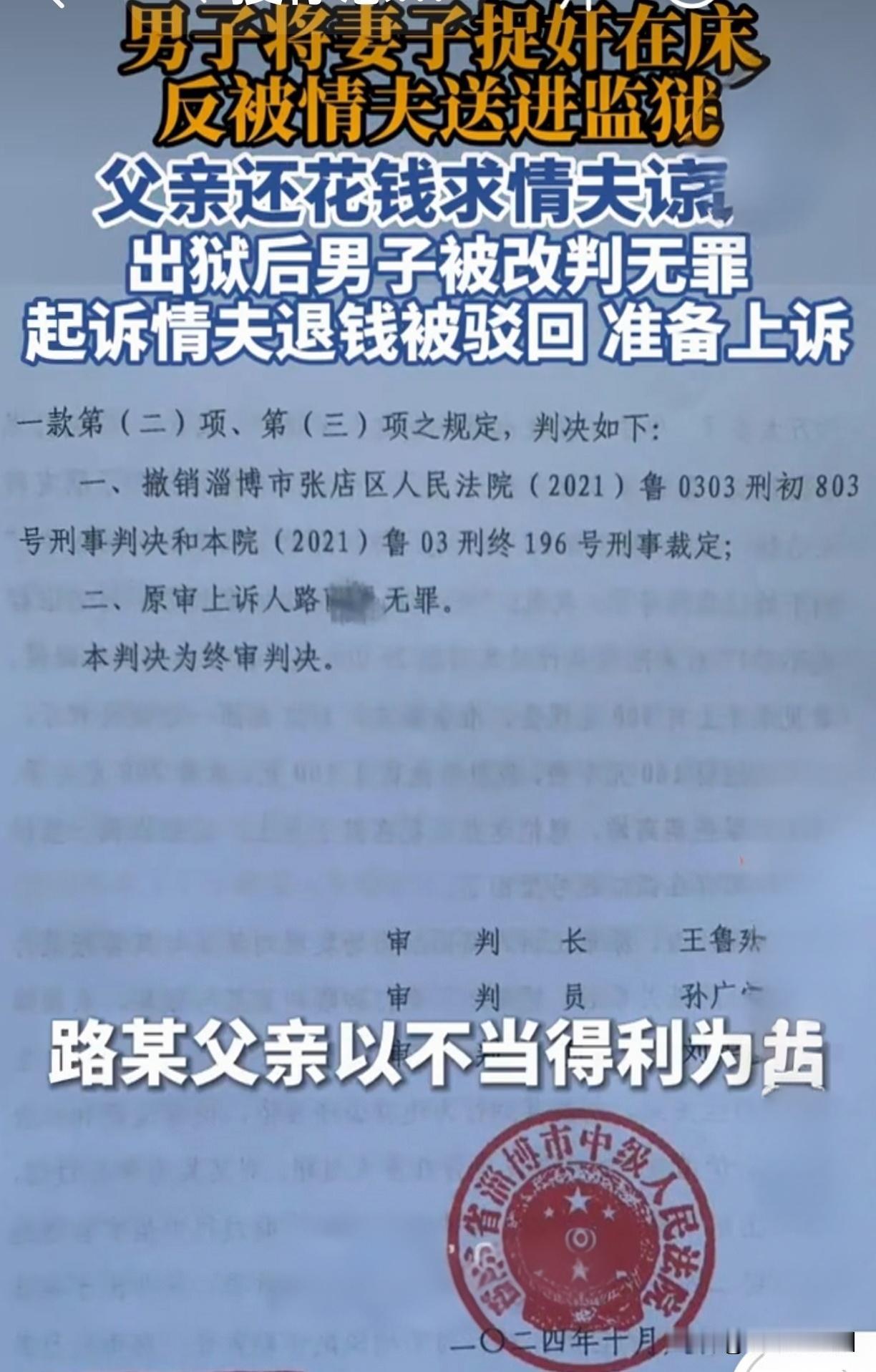 捉奸收2.5万被判刑,改判无罪后钱却飞了?法院的驳回理由让人沉默 山东淄博男子路某,五年前在酒店撞破妻子与情夫的私情。愤怒之下拍了视频,情夫主动提出“补偿”,双方协商后转账25000元,路某还贴心留下100元给对方当路费。结果十几天后,情夫反手报警称被敲诈,路某因敲诈勒索罪被判刑6个月! 为了取保候审,路某父亲紧急把这25000元退还给情夫,换回一纸谅解书,可儿子还是坐了牢。 路家不服,坚持申诉三年。直到2024年10月,淄博中院再审改判路某无罪!法院认定:路某的肢体冲突是撞破奸情后的情绪宣泄,并非为索财;情夫明知对方已婚仍出轨,对案件有重大过错;那25000元是情夫主动提出、双方协商的补偿,路某没有非法占有目的,不构成敲诈勒索。 刑事官司赢了,清白回来了,可那笔钱呢? 路父转身以“不当得利”起诉情夫,要求返还当年为求谅解退回去的25000元。结果今年3月,法院一纸裁定驳回起诉!理由像一盆冷水:一是路父是代子退款,诉讼主体不适格;二是这钱源于婚外情引发的“不法原因给付”,法律对此既不保护也不反对,不属于民事受理范围。 这个裁定把路家推向了深渊:儿子白坐了牢,父亲白掏了钱,情夫白赚了2.5万? 路家明确表示要上诉。律师提出新思路:路父是基于“误以为儿子犯罪”的重大误解才退的钱,情夫拿着这笔钱根本没有合法依据。 这事儿在网上吵翻了。有人说情夫太阴损,睡了人家老婆,拿了钱还把人送进监狱,最后还白拿2.5万,天理何在?也有人觉得路某收钱确实游走在法律边缘,父亲自愿退款后反悔,程序上确实难赢。 其实最扎心的是:法律保护公民权利,但面对婚外情这种“不道德”,法律选择了沉默。情夫违背公序良俗,却在这场官司里毫发无损;受害者虽然恢复了清白,却要为当初那一拳和收钱的决定付出真金白银的代价。 这起案子给我们普通人敲响警钟:遇到配偶出轨,再愤怒也要守住法律红线——固定证据要合法,千万别动手;更不要私下收钱,无论对方多主动,一旦伸手,就可能从“受害人”变成“嫌疑人”。有维权诉求,请直接走法院诉讼,别让自己二次受伤。 如果是你,撞见这种事,能忍住不动手、不收钱吗?欢迎在评论区聊聊。 作者申明: 内容取材于网络,此案件综合自《中国新闻周刊》《新京报》《扬子晚报/紫牛新闻》及凤凰网等多家媒体的公开报道,目前已进入上诉程序。