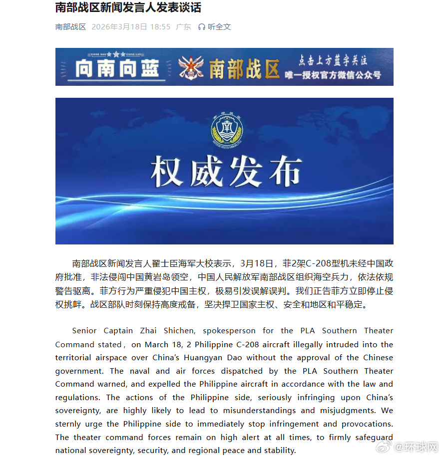 #南部战区正告菲方立即停止侵权挑衅#【菲2架C-208型机非法侵闯中国黄岩岛领空被警告驱离,南部战区正告菲方:立即停止侵权挑衅】南部战区新闻发言人翟士臣海军大校表示,3月18日,菲2架C-208型机未经中国政府批准,非法侵闯中国黄岩岛领空,中国人民解放军南部战区组织海空兵力,依法依规警告驱离。菲方行为严重侵犯中国主权,极易引发误解误判。我们正告菲方立即停止侵权挑衅。战区部队时刻保持高度戒备,坚决捍卫国家主权、安全和地区和平稳定。(南部战区)