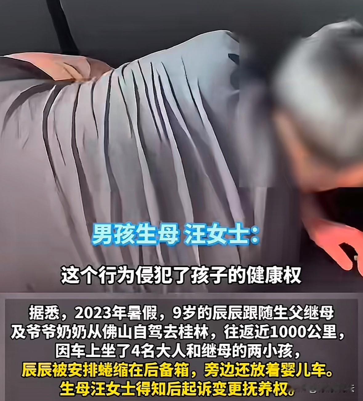 有了后妈就有后爹!广东,一男孩随父亲和继母外出旅游,继母的两个孩子坐在后座,而男孩则被父亲和继母塞进了后备箱,后备箱还堆放着行李,男孩在狭小的空间里整整蜷缩了1000多公里的路程,闷热难忍的时候,也只能把头凑到窗户缝上呼吸两口新鲜空气。生母得知此事后,愤怒不已,以侵害孩子的生命权、健康权将父亲告上法庭,要求赔偿和道歉。然而,父亲的态度却引怒全网! 居住在广东佛山的刘先生决定带着一家人去桂林旅游。 还没出发,刘先生就遇到了一个棘手的问题,家里人太多,可是车子的容量却有限。 刘先生是再婚家庭,自己带着一个儿子,叫辰辰,二婚妻子带着两个孩子,一家五口。 此次旅行,刘先生还想尽尽孝心,想带着爸妈一起,这算下来,就是7个人。 就在刘先生犯难该怎么安排座位时,突然想到了后备箱其实也能放一个孩子,有了解决办法后,刘先生的心情也舒坦了很多。 可问题是,把哪个孩子放在后备箱呢? 把妻子的孩子放后备箱,势必会引发夫妻矛盾,于是刘先生就将目光落在了辰辰身上。 他走到儿子身边,眼神有些闪躲,说:“儿子,咱家车太小,坐不下这么多人,你看能否委屈下,坐后备箱?路程也不长,爸爸开快点,很快就到了。” 辰辰不是很乐意,谁都知道窝后备箱不是个滋味,空间狭小不说,还黑不溜秋的。 可他一个9岁的孩子,能有什么办法,要跟着大家一起去旅游,只能听从爸爸的建议了。 出发那天,辰辰也没想到,后备箱并非属于他一个人的空间,里面还堆放着行李,还有一个推车,仅这些东西就占去了一半的空间。 虽然心里委屈,可他还是咬咬牙,钻进了狭小的空间。 一路上时不时会被颠簸的汽车撞到,闷热的喘不过气时,他只能伸着头凑到车窗缝边儿呼吸一下新鲜空气。 他的身体也只能蜷成一团,四肢根本无法伸展,时间长了,感觉腿麻脚酸的,实在难受。 这只是生理上的难受,还有心理上的委屈。 尤其听到车里传来爷爷奶奶和继母两个孩子说说笑笑的声音时,眼泪都会在眼睛里打转。 就这样,他来回整整忍了1000多公里的路程。 旅游结束后,辰辰越想越委屈,觉得父亲不公平,他才是父亲亲生的,可父亲却如此对他。于是便将此事告诉了母亲。 他一边说,一边委屈地哭了起来。 母亲汪女士听后,又是心疼,又是愤怒,气得浑身发抖,她无法想象儿子在那样遥远的路途中遭受了怎样的折磨。 仅仅一次履行,儿子就遭受了如此大的委屈,那平日里的生活呢?父亲和继母又是怎样对他的?汪女士不敢往下下。 于是,她当即便做了个重大决定,以侵害孩子的生命权、健康权为由,将刘先生和妻子告上了法庭,要求道歉和赔偿。 有人说:有了后妈就有后爹,这句话在这位父亲身上体现得淋漓尽致。 还有人说:应该体谅这位父亲,毕竟他也是想带着全家一起去旅行。 《未成年人保护法第16条》监护人应保护未成年人安全、健康,不得使其处于危险境地。 法院审理认为,刘先生和妻子的侵权行为并未对原告辰辰造成不良影响,不予支持。 但放任辰辰坐后备箱的行为构成健康权的侵害,支持精神赔偿精神损害抚慰金3000元。 面对全网的谴责,刘先生却没有意识到自己的错误,他说很多家庭都是这样操作的,他的行为很正常,不需要道歉。他决定上诉! 刘先生和妻子这种行为,或许是出于无意,但也确实给辰辰造成了身体和精神上的伤害,理应道歉。 父母对子女有法定的抚养保护义务,即便是二婚重组家庭,也不应该忽视孩子的感受,要给予他们应有的关爱和呵护。 对此,你怎么看!