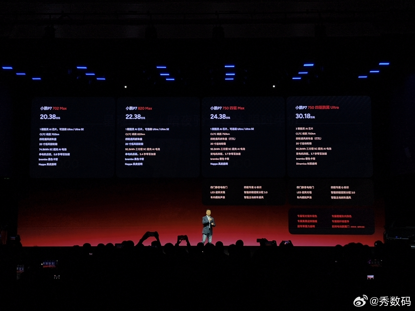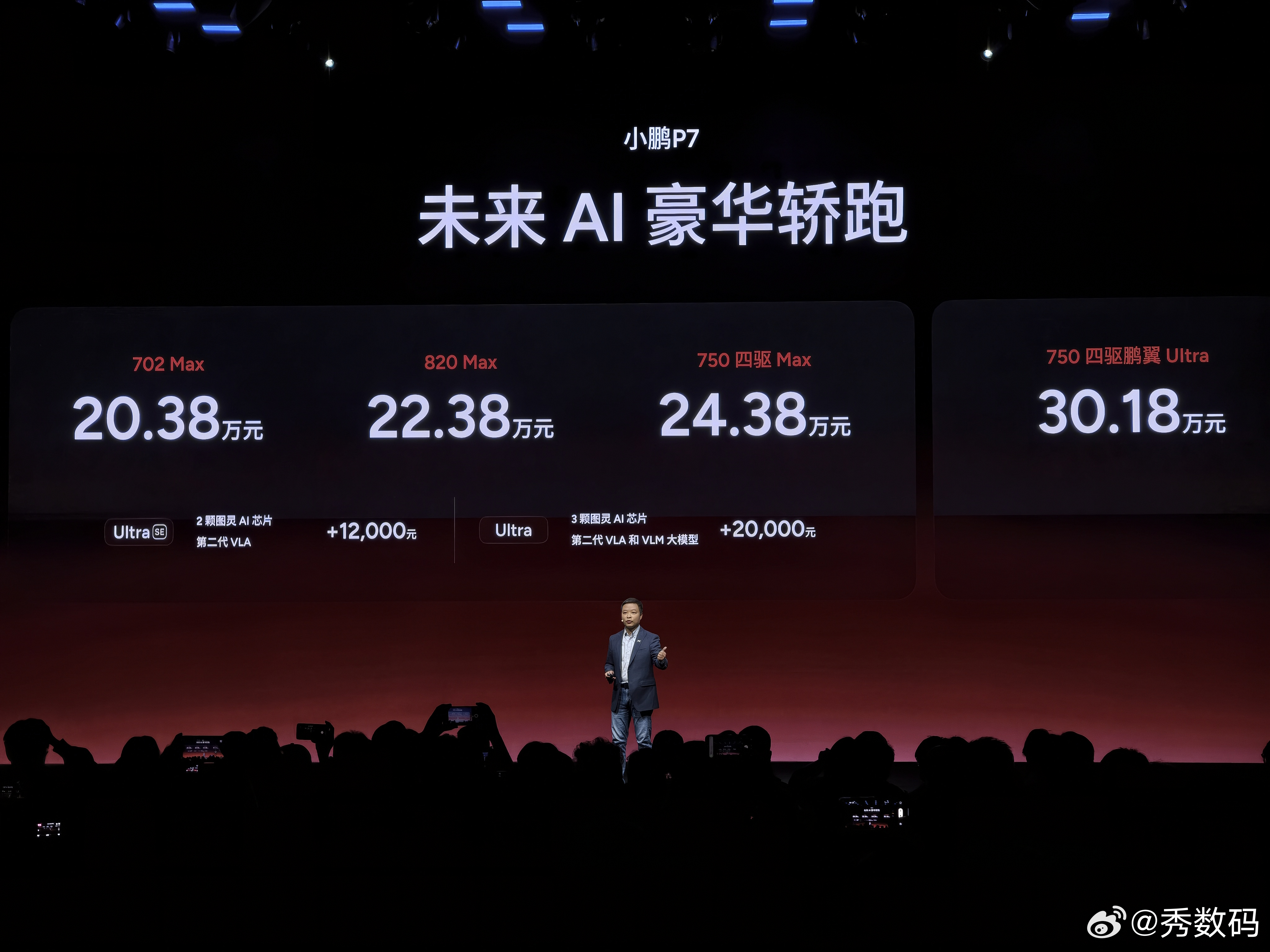 未来AI豪华轿跑--小鹏P7重磅上市!官方指导价:·702 Max版 20.38万元·820 Max版 22.38万元·750 四驱 Max版24.38万元·750 四驱鹏翼 Ultra版 30.18万元在Max版基础上,加1.2万元即可升级为搭载2颗图灵AI芯片+第二代VLA的Ultra SE、加2万元可升级为搭载3颗图灵AI芯片+第二代VLA和VLM大模型的Ultra。