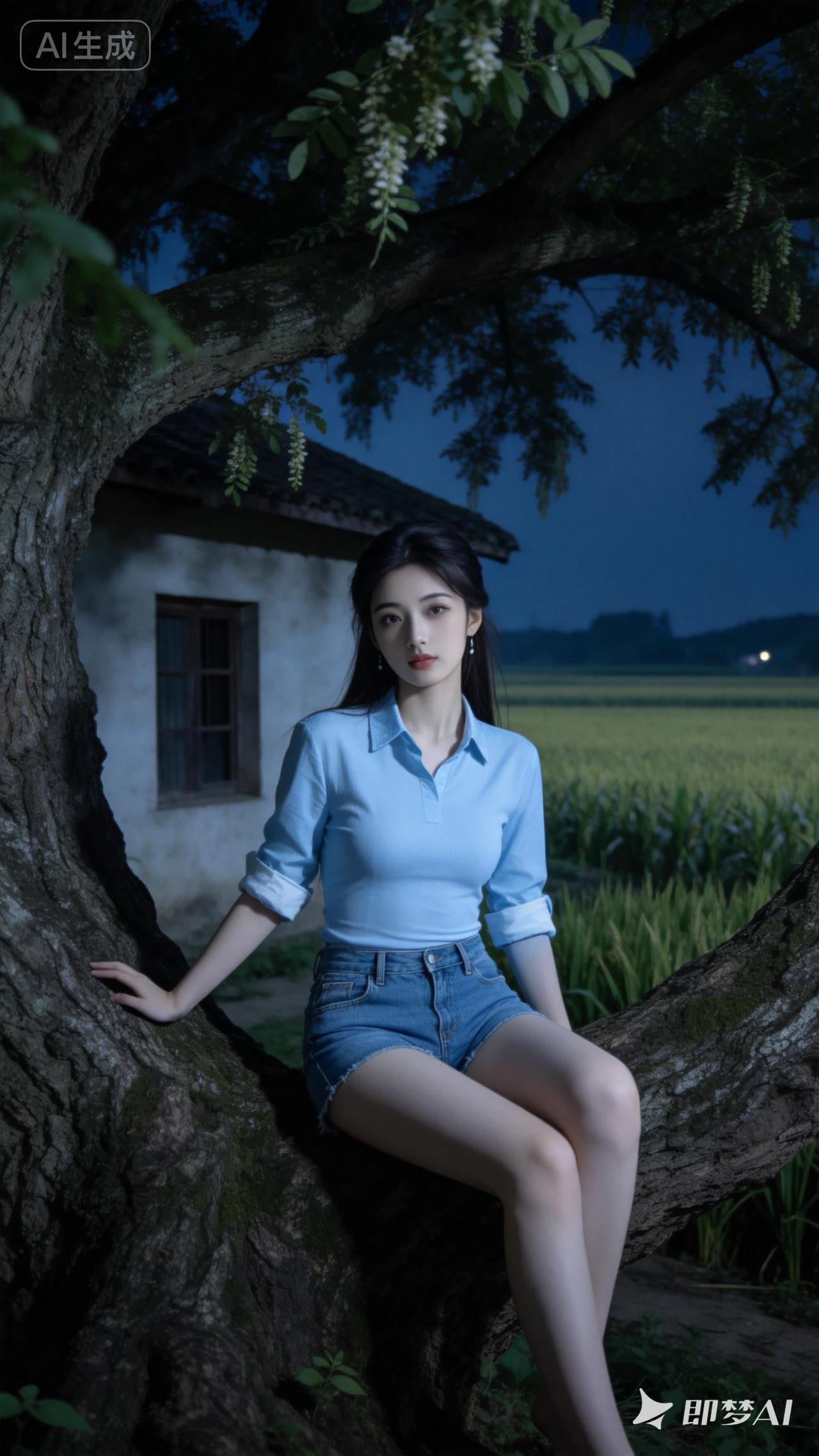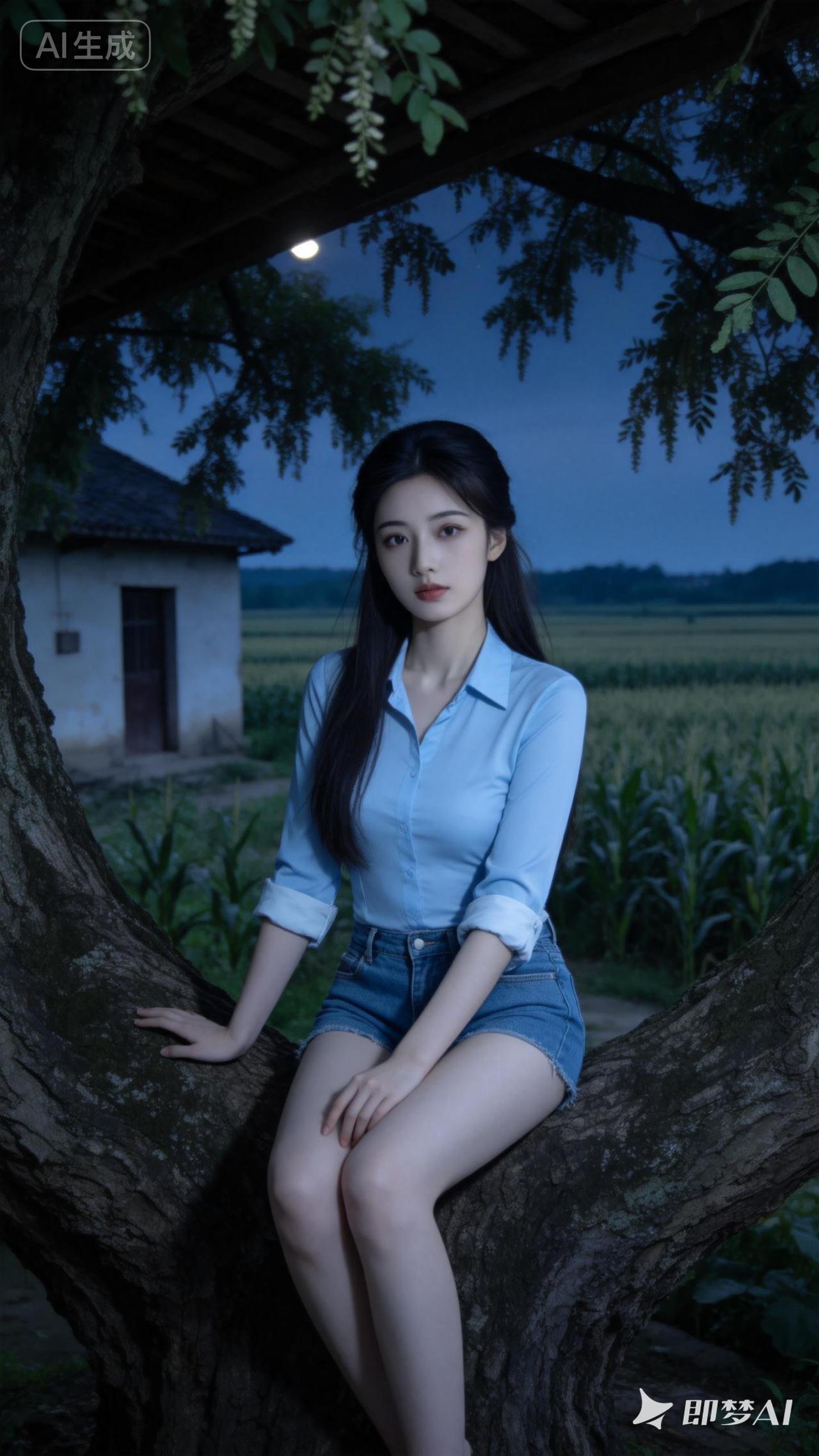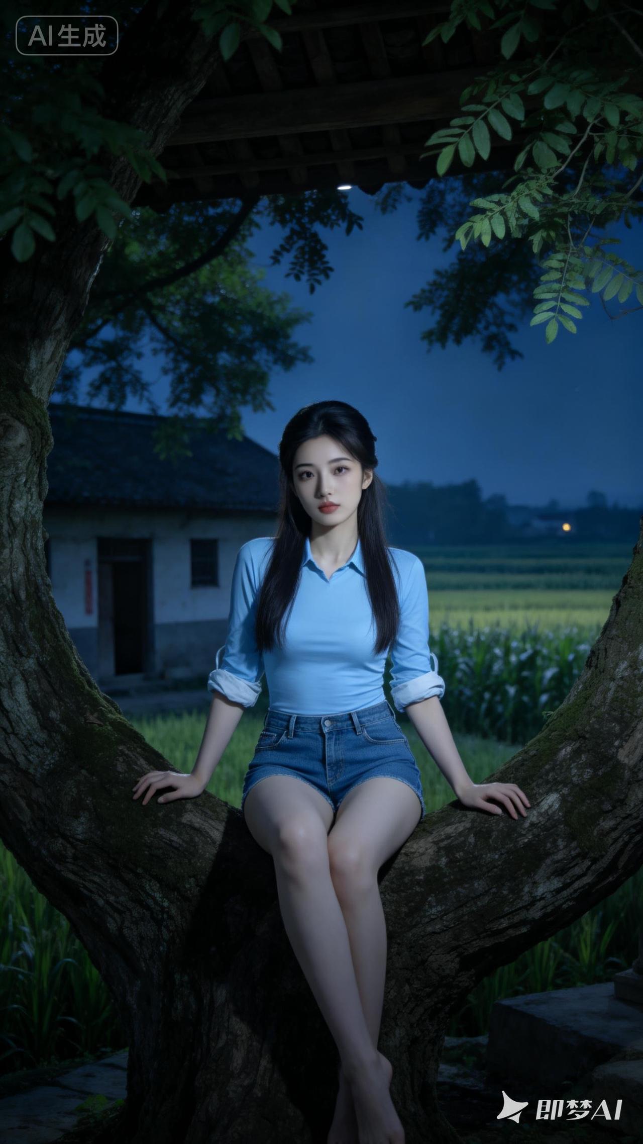 夜晚的乡村,少女坐在树杈上,宁静而美丽。