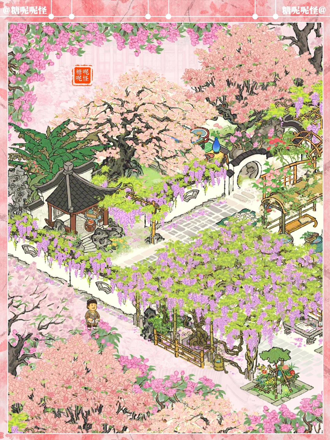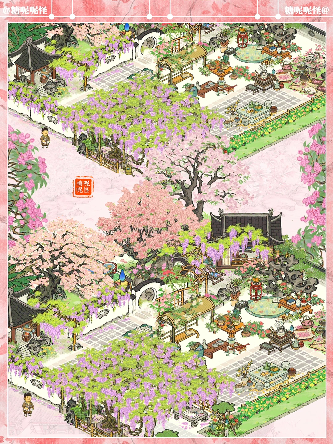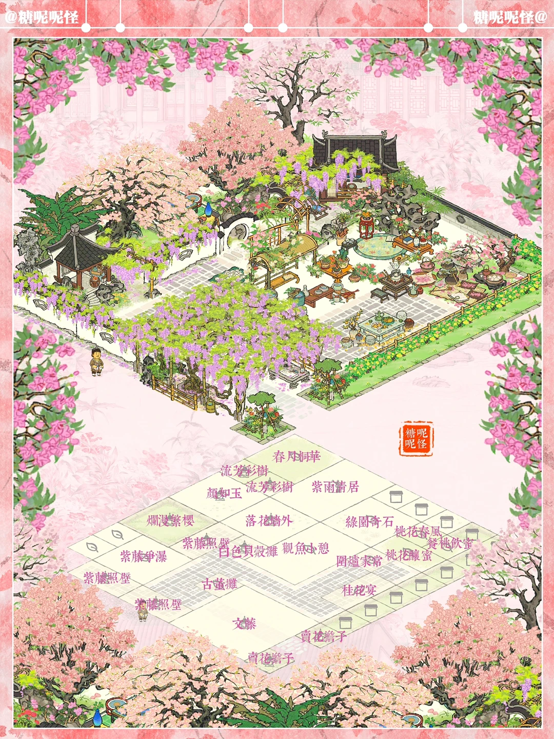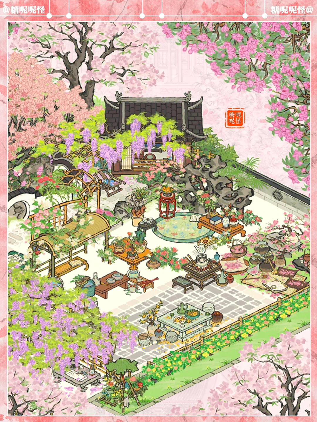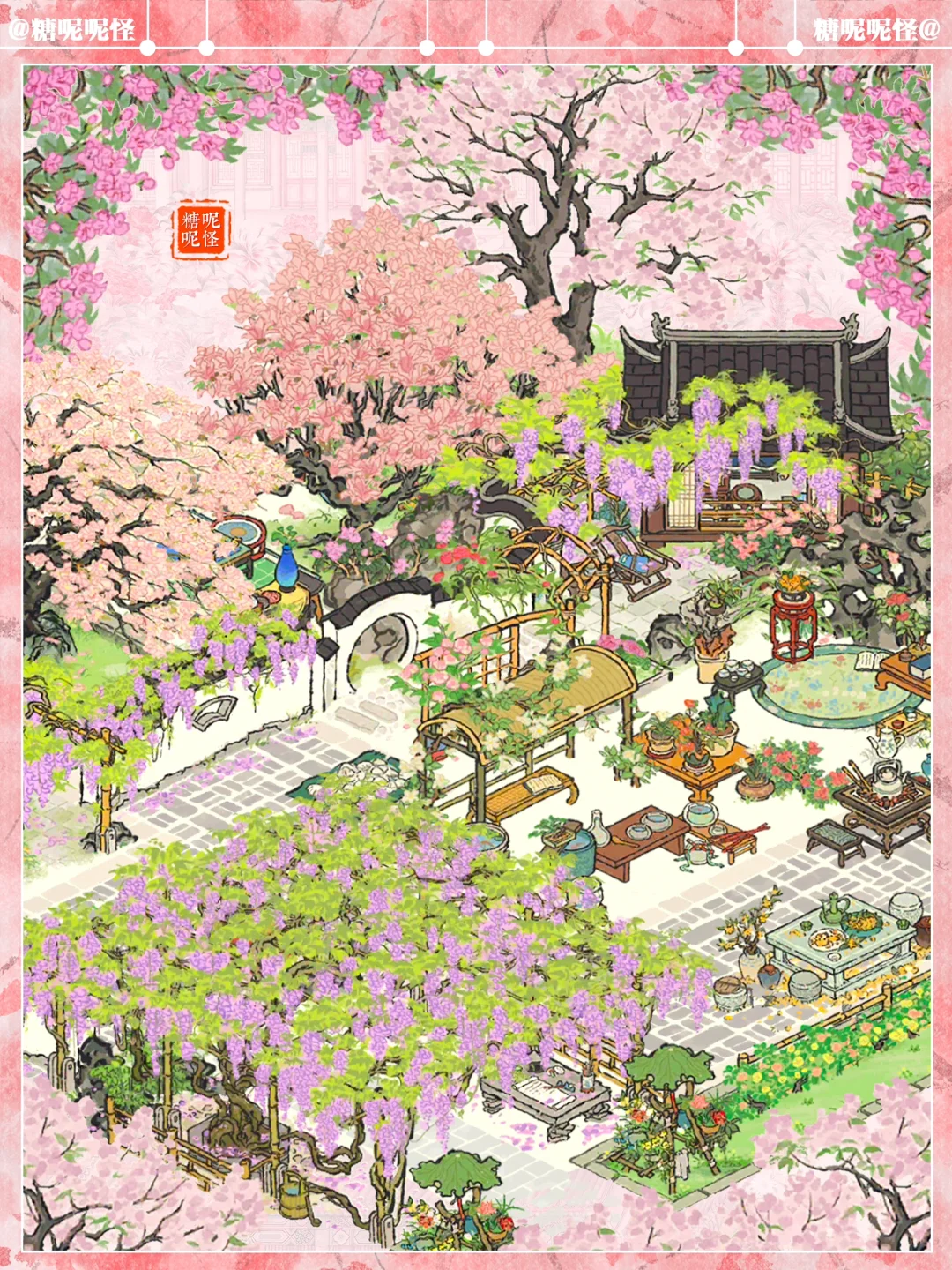 🌸春限【落花墙外】的一个小布局 🌸和去年春限【紫雨清居】尊嘟好搭 🌸建筑:落花墙外|紫雨清居|文藤|紫藤争瀑|紫藤照壁|烂漫繁樱|春月桐华|观鱼小憩|颜如玉