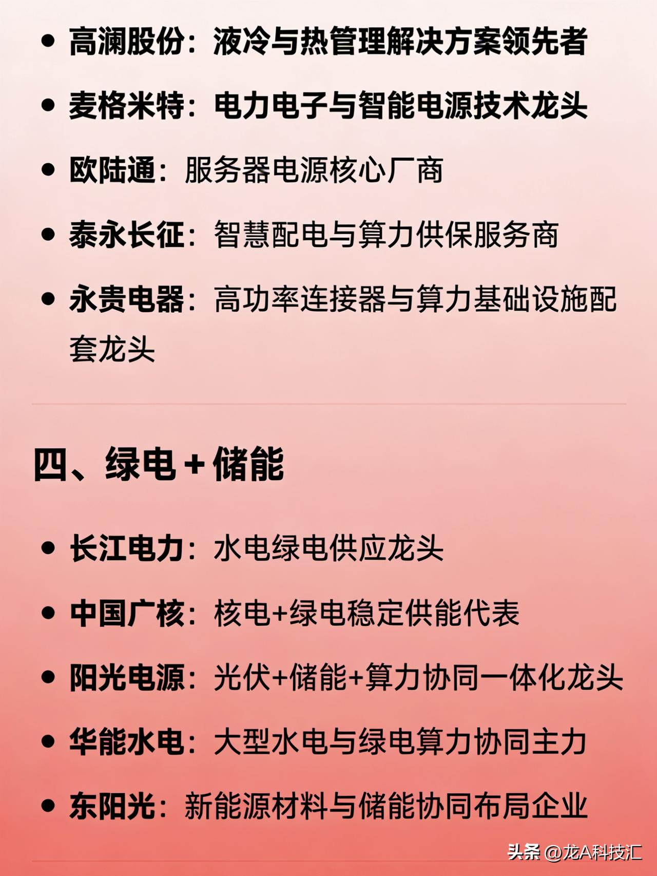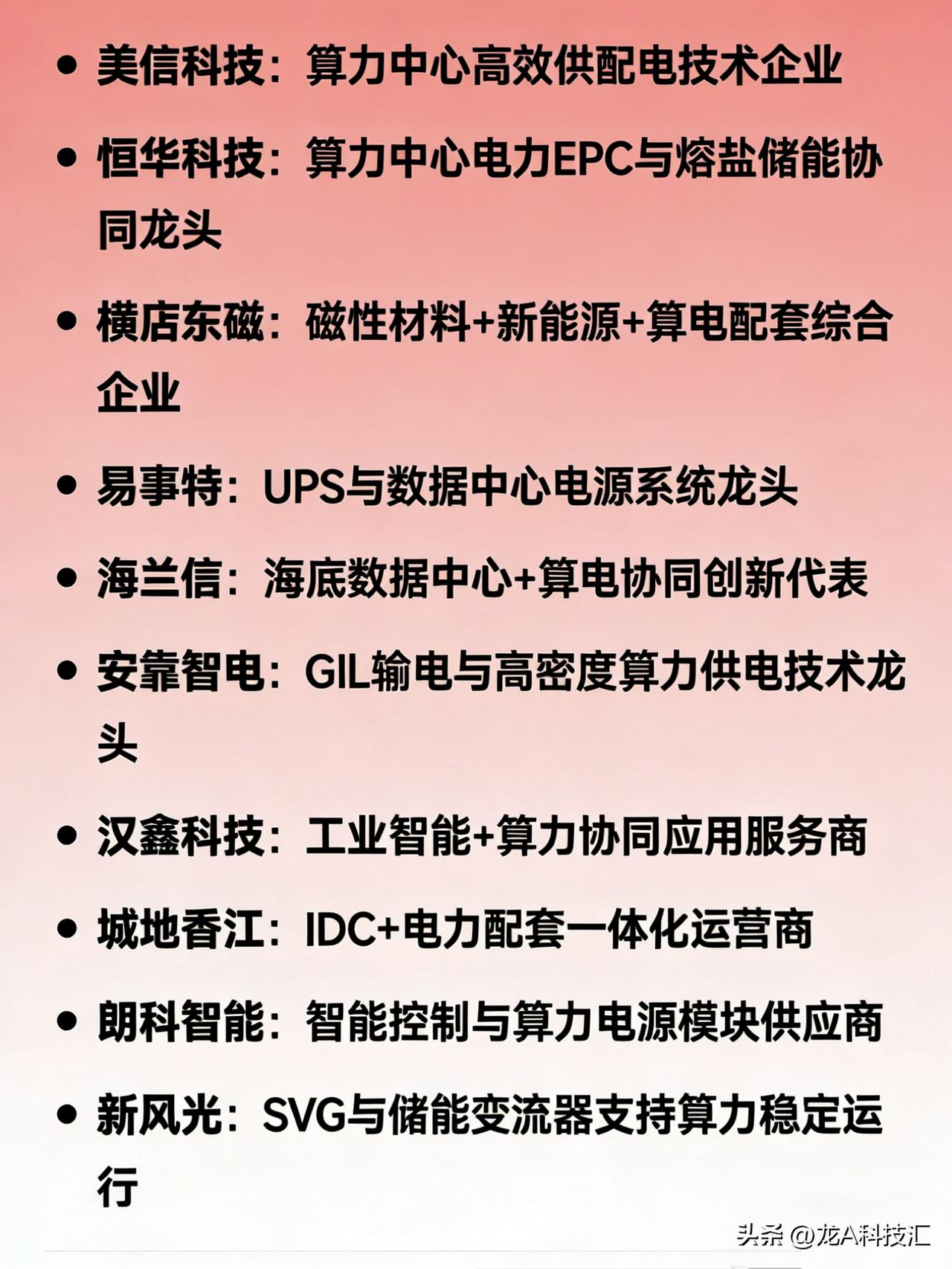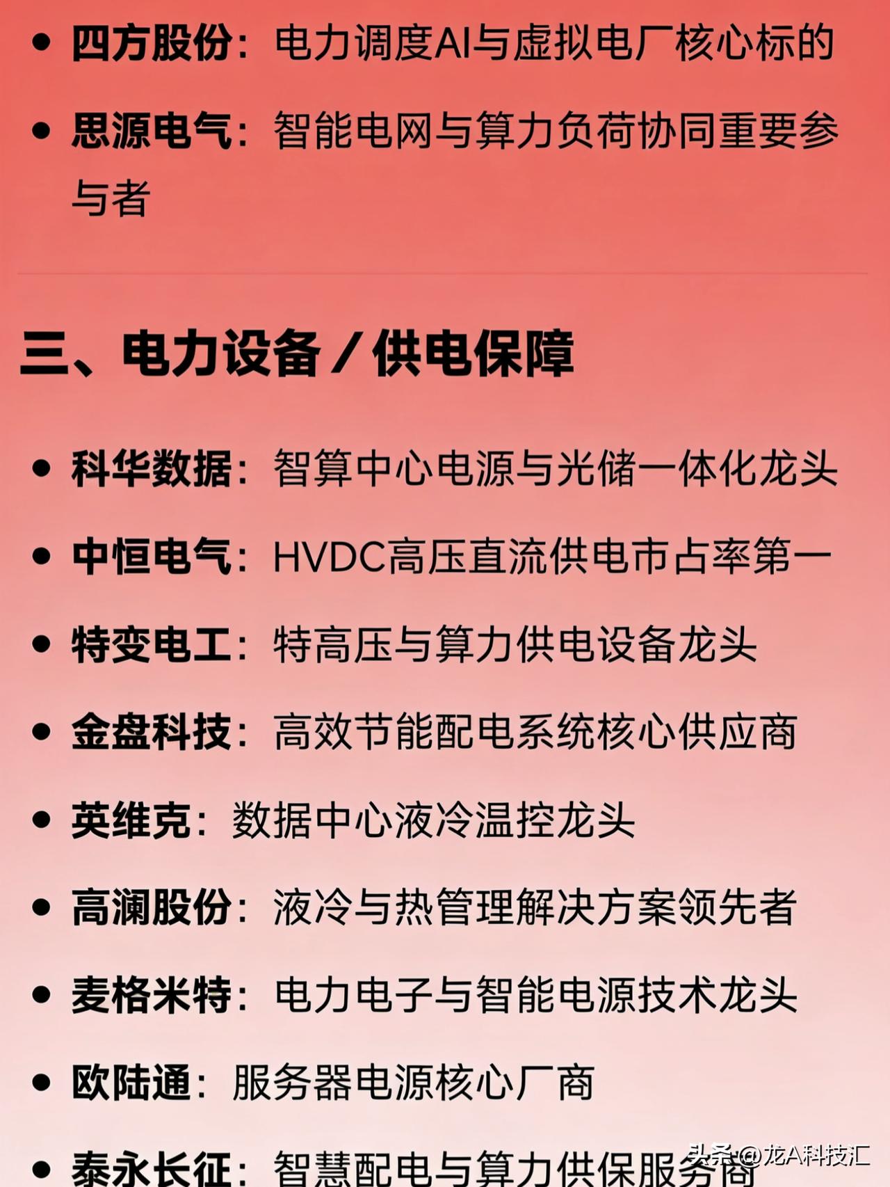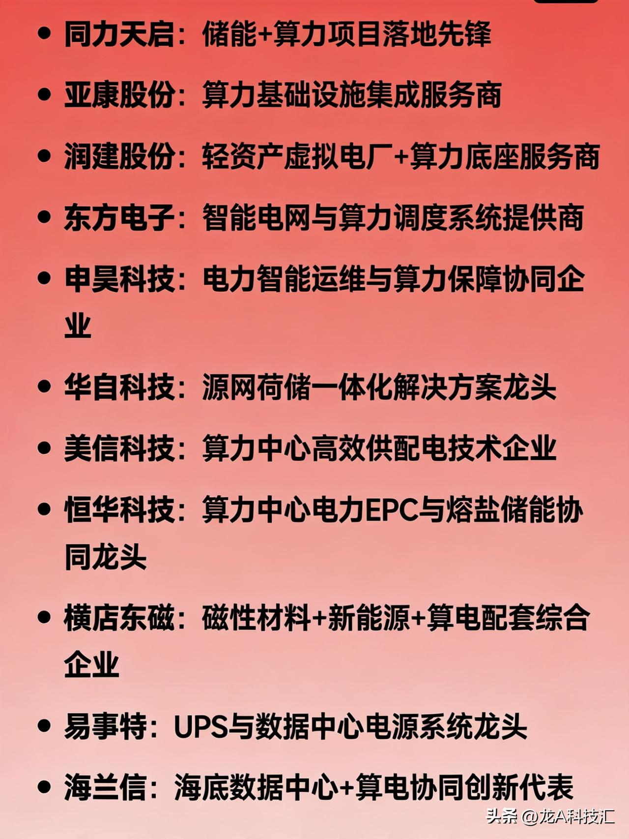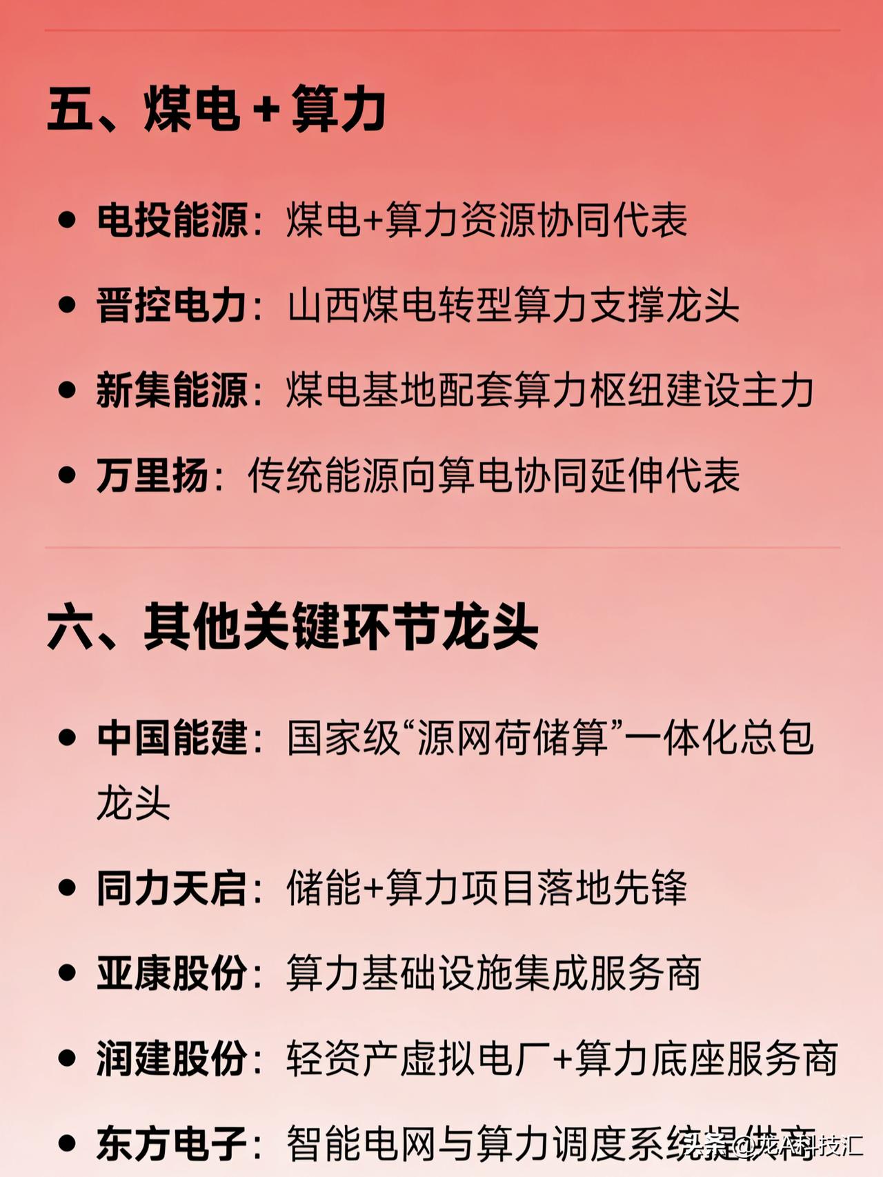 算力协同概念相关龙头企业的分类汇总 一、综合龙头(电+算双主业) 协鑫能科:唯一“电力+算力”双主营龙头 豫能控股:“火电+算力”融合龙头 金开新能:绿电+算力一体化标杆 山高控股:综合能源与算力协同布局代表 二、电网算力调度(算电大脑) 国电南瑞:电网AI调度绝对龙头 南网数字:南方电网算电协同数字化平台龙头 四方股份:电力调度AI与虚拟电厂核心标的 思源电气:智能电网与算力负荷协同重要参与者 三、电力设备/供电保障 科华数据:智算中心电源与光储一体化龙头 中恒电气:HVDC高压直流供电市占率第一 特变电工:特高压与算力供电设备龙头 金盘科技:高效节能配电系统核心供应商 英维克:数据中心液冷温控龙头 高澜股份:液冷与热管理解决方案领先者 麦格米特:电力电子与智能电源技术龙头 欧陆通:服务器电源核心厂商 泰永长征:智慧配电与算力供保服务商 永贵电器:高功率连接器与算力基础设施配套龙头 四、绿电+储能 长江电力:水电绿电供应龙头 中国广核:核电+绿电稳定供能代表 阳光电源:光伏+储能+算力协同一体化龙头 华能水电:大型水电与绿电算力协同主力 东阳光:新能源材料与储能协同布局企业 五、煤电+算力 电投能源:煤电+算力资源协同代表 晋控电力:山西煤电转型算力支撑龙头 新集能源:煤电基地配套算力枢纽建设主力 万里扬:传统能源向算电协同延伸代表 六、其他关键环节龙头 中国能建:国家级“源网荷储算”一体化总包龙头 同力天启:储能+算力项目落地先锋 亚康股份:算力基础设施集成服务商 润建股份:轻资产虚拟电厂+算力底座服务商 东方电子:智能电网与算力调度系统提供商 申昊科技:电力智能运维与算力保障协同企业 华自科技:源网荷储一体化解决方案龙头 美信科技:算力中心高效供配电技术企业 恒华科技:算力中心电力EPC与熔盐储能协同龙头 横店东磁:磁性材料+新能源+算电配套综合企业 易事特:UPS与数据中心电源系统龙头 海兰信:海底数据中心+算电协同创新代表 安靠智电:GIL输电与高密度算力供电技术龙头 汉鑫科技:工业智能+算力协同应用服务商 城地香江:IDC+电力配套一体化运营商 朗科智能:智能控制与算力电源模块供应商 新风光:SVG与储能变流器支持算力稳定运行 免责声明:发文涉及资讯图等内容来自网络公共信息。仅供参考,不构成投资建议。