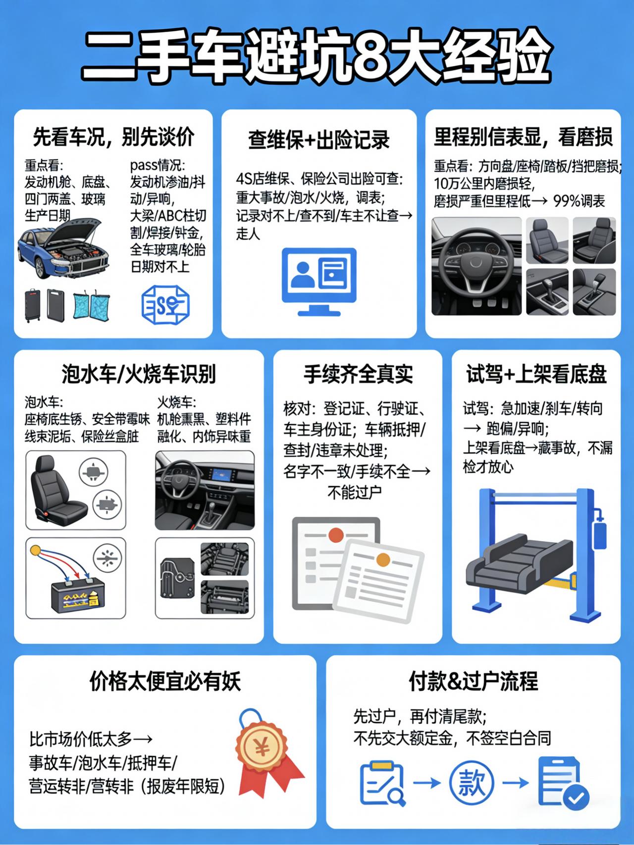 二手车避坑经验,都是买车时最容易踩的雷,照着看基本不会被坑: 1. 先看车况,别先谈价 - 重点看:发动机舱、底盘、四门两盖、玻璃生产日期 - 有这些情况直接pass: - 发动机渗油、抖动、异响 - 大梁、ABC柱有切割、焊接、钣金痕迹(大事故车) - 全车玻璃/轮胎日期对不上,大概率跑得多或撞得多 2. 必须查维保+出险记录 - 4S店维保、保险公司出险一查就清楚: - 有没有重大事故、泡水、火烧 - 真实里程有没有被调表 - 记录对不上、查不到、车主不让查:直接走人。 3. 里程别信表显,看磨损 调表车很常见,重点看: - 方向盘、座椅、踏板、挡把磨损 - 10万公里以内通常磨损很轻 - 磨损严重但里程很低:99%调表 4. 泡水车、火烧车一眼识别 - 泡水车:座椅底下生锈、安全带霉味、线束泥垢、保险丝盒脏 - 火烧车:机舱熏黑、塑料件融化痕迹、内饰异味重 这类车再便宜也不能买,安全隐患极大。 5. 手续一定要齐全、真实 核对: - 登记证(大绿本)、行驶证、车主身份证 - 车辆是否抵押、查封、违章未处理 - 名字不一致、手续不全:不能过户,千万别买。 6. 一定要试驾+上架看底盘 - 试驾:急加速、刹车、转向,看跑偏、异响 - 上架看底盘:最容易藏事故,不漏检才放心 7. 价格太便宜,必有妖 - 比市场价低太多: 事故车、泡水车、抵押车、营运转非、营转非(报废年限短) 8. 付款&过户流程 - 先过户,再付清尾款 - 不先交大额定金,不签空白合同 二手车没有真正的捡漏,只有藏不住的坑。不贪低价、不心急下单,把车况和手续盯死,就能避开90%的套路,买得踏实,开得安心。【来自懂车帝车友圈】