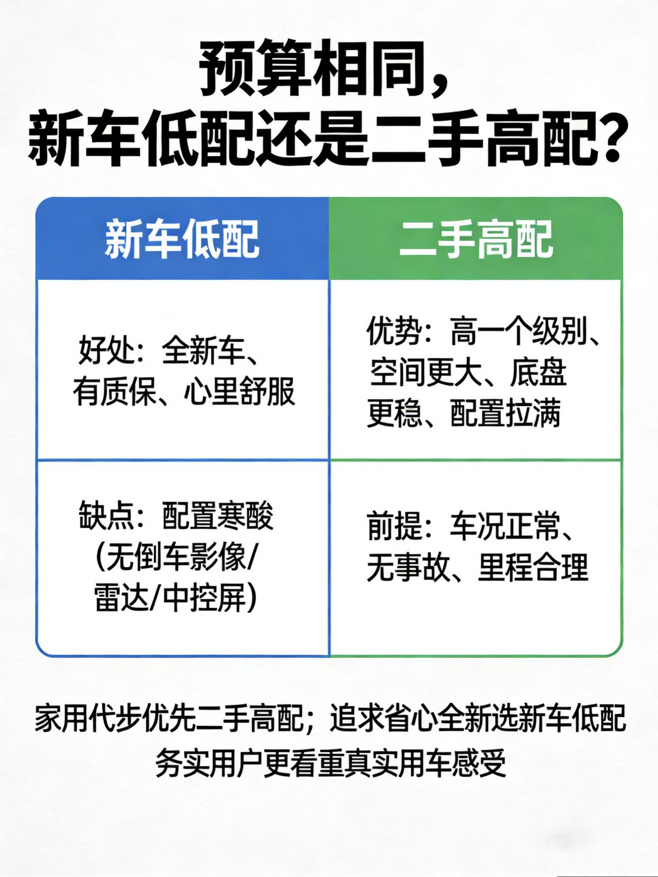 同价位:新车低配 VS 二手高配,我这么选 同样预算,很多人纠结:选新车低配,还是二手高配?我的观点很明确:家用代步,优先二手高配;只想完全省心全新,再选新车低配。 新车低配的好处是:全新车、有质保、心里舒服。但缺点也很明显:配置寒酸,很多连倒车影像、雷达、中控屏都没有,用起来很不方便。 二手高配比它高一个级别,空间更大、底盘更稳、配置拉满,开起来质感完全不在一个层次。只要车况正常、无事故、里程合理,用起来非常香。 对务实的家庭用户来说,日常体验远比“全新”两个字重要。没有绝对对错,就看你更看重面子新鲜感,还是真实用车感受。【来自懂车帝车友圈】