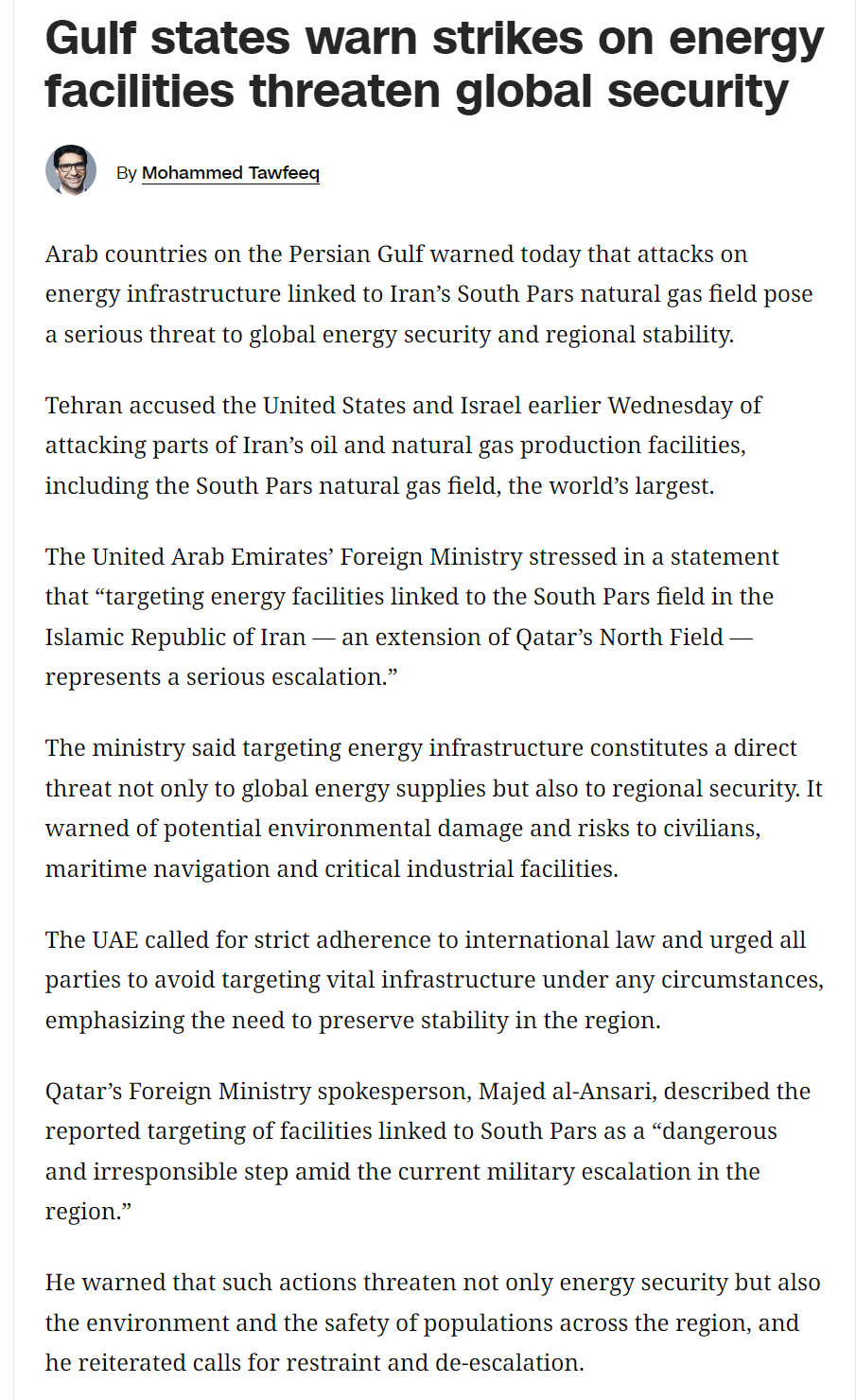🔻波斯湾沿岸的阿拉伯国家今日警告称,针对伊朗南帕尔斯天然气田相关能源基础设施的袭击,对全球能源安全与地区稳定构成严重威胁。🔻德黑兰方面周三早些时候指控美国与以色列袭击了伊朗部分石油和天然气生产设施,其中包括全球储量最大的南帕尔斯天然气田。🔻阿联酋外交部在声明中强调:"针对伊朗伊斯兰共和国南帕尔斯天然气田(系卡塔尔北方气田延伸带)相关能源设施的袭击,意味着局势的严重升级。"该部门表示,针对能源基础设施的袭击不仅直接威胁全球能源供应,更危及地区安全,并警告此举可能导致环境破坏,对平民、海上航行及关键工业设施构成风险。🔻阿联酋呼吁严格遵守国际法,并敦促各方在任何情况下都避免针对关键基础设施,强调必须维护该地区的稳定。🔻卡塔尔外交部发言人迈杰德·安萨里将据称针对南帕尔斯相关设施的袭击描述为“在当前地区军事升级背景下的危险且不负责任的举动”。🔻他警告称,此类行为不仅威胁能源安全,还危及整个地区的环境和民众安全,并重申了呼吁各方保持克制、缓和局势的立场。🔻via CNN伊朗发射集束弹头导弹袭击以色列伊朗石油工业设施遭袭海外新鲜事中东现场直击