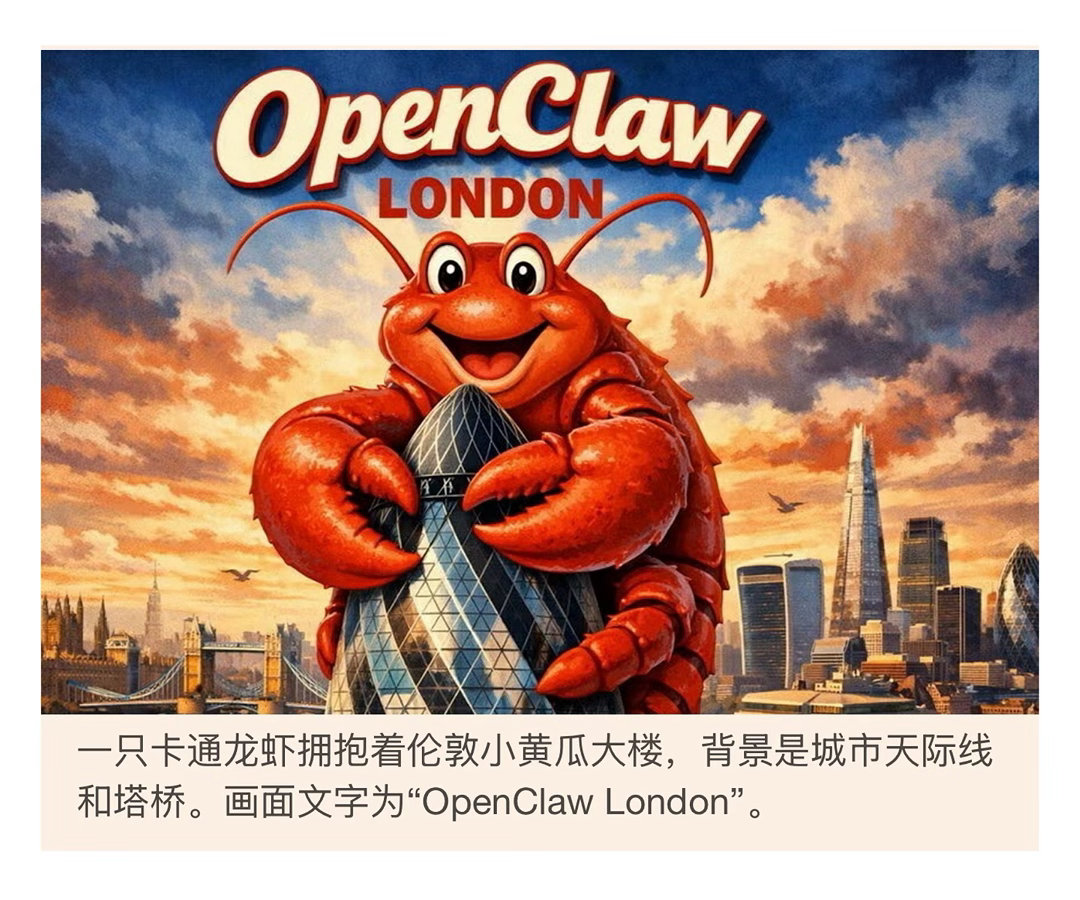 本周,爆红的AI智能体OpenClaw的粉丝聚会发出了邀请函。邀请函上画着一只咧嘴微笑的巨型龙虾,蹲在伦敦“小黄瓜”大楼顶上。不久前,纽约一场“ClawCon”活动上,有参与者戴着龙虾钳发箍合影。本月柏林版的玩法,则是一整晚“技术深度分享加音乐活动”。