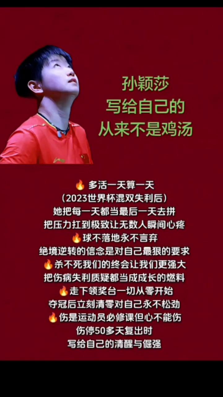 孙颖莎写给自己的从来不是鸡汤。 多活一天算一天,(2023世界杯混双失利后)她把每一天都当最后一天去拼,把压力扛到极致让无数人瞬间心疼。球不落地永不言弃,绝境逆转的信念是对自己最狠的要求。杀不死我们的终会让我们更强大,把伤病、失利、质疑都当成成长的燃料,走下领奖台一切从零开始,夺冠后立刻清零对自己永不松劲。 伤是运动员必修课但心不能伤,伤停50多天复出时写给自己的清醒与倔强。