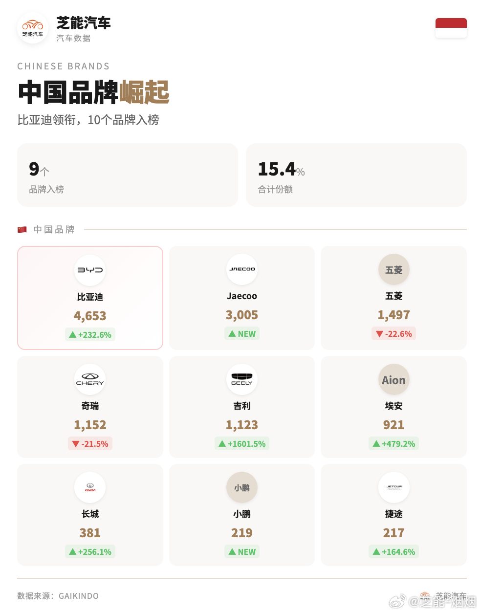 整体来看,印尼车市正从日系独大走向多元竞争,中国品牌凭借技术与产品优势,持续打破原有市场格局,出海势头强劲。