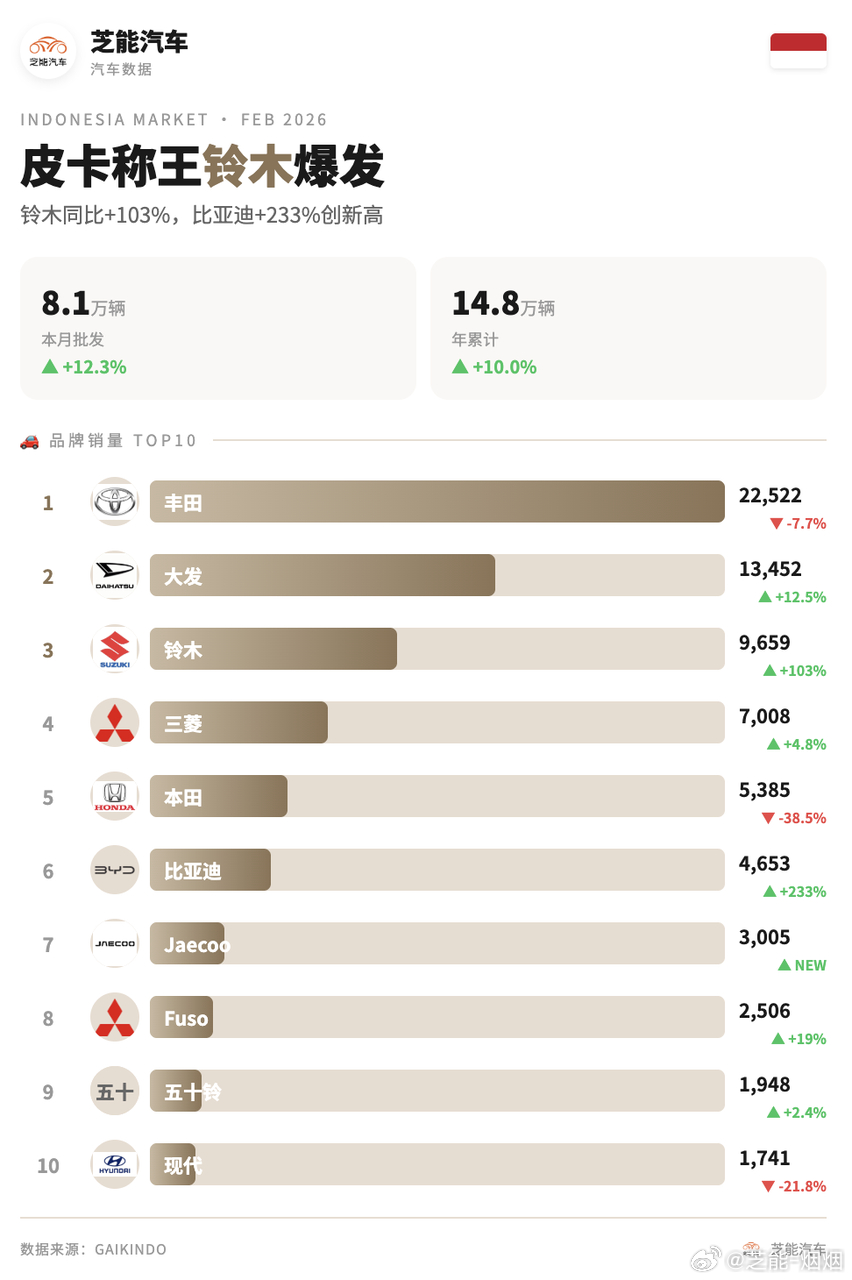 2026 年 2 月印尼车市整体增长,日系品牌仍占据主导,但内部出现明显分化,部分品牌销量下滑明显。中国品牌表现强势,依托新能源与高配置实现高速增长,多家品牌跻身市场前列,成为拉动增量的关键力量。同时,当地生产工具类车型需求旺盛,皮卡车型持续走俏。