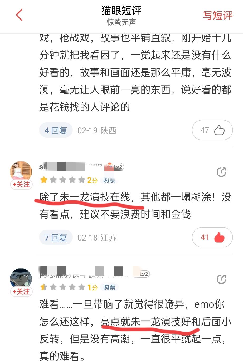 惊蛰无声上映30天,第一次去猫眼评论区溜了一圈,说好看,说不好看都有。认为好的打五星,认为烂片的打一星三星。翻了没有几楼,看到打一星的不少。这一颗星给的不是导演,不是编剧,不是那个全剧一副面孔的4。[笑哭]这一颗星观众明确说给朱一龙,没有朱一龙精彩表演估计这部电影打零分,打半颗星的人也很多。说朱一龙撑起《惊蛰无声》票房这必须是真的[赞]这么苛刻的观众都愿意给他一颗星表示尊重。[捂脸]票房13亿了,有11亿是朱一龙带来的观众。