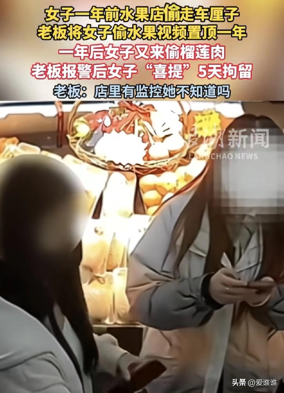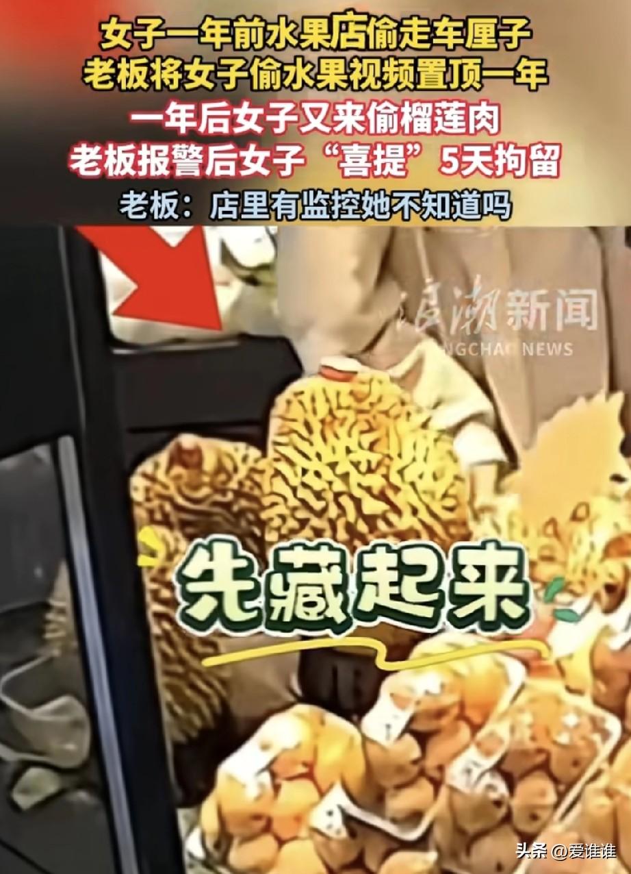 武汉,年轻姑娘一年前在水果店偷走一盒车厘子,老板为了表示愤怒,将她偷盗的视频发在了抖音上,没想到一年后她又来了,这次偷了一盒榴莲,老板发现后又气又笑,说她难道不知道店里有监控吗,网友说:“真执着,在哪里偷过,还去哪里偷!”随后老板报警。 一年前这位年轻姑娘就在这家水果店偷了盒车厘子,老板当时没报警,但把监控视频截下来,在店里和网上一直放着,一放就是一年多。 没想到,前几天这姑娘又来了,她拿了把香蕉去结账,趁店员不注意,顺手把一盒榴莲肉藏起来,最后只付了香蕉钱就走了,老板一看监控,又是她,直接报了警。 警察很快把人找到,因为这是第二次偷,姑娘被行政拘留了5天,拘留期满后,警察还专门带她回水果店,让她当场把80块钱榴莲钱付了。 老板挺纳闷:店里的监控那么明显,难道她看不见吗! 网友议论纷纷:有人笑她胆大,有人觉得她心存侥幸,不管怎么说,为了一盒水果搭上5天自由,这笔账怎么算都划不来,还是那句话,千万别伸手,伸手必被捉!