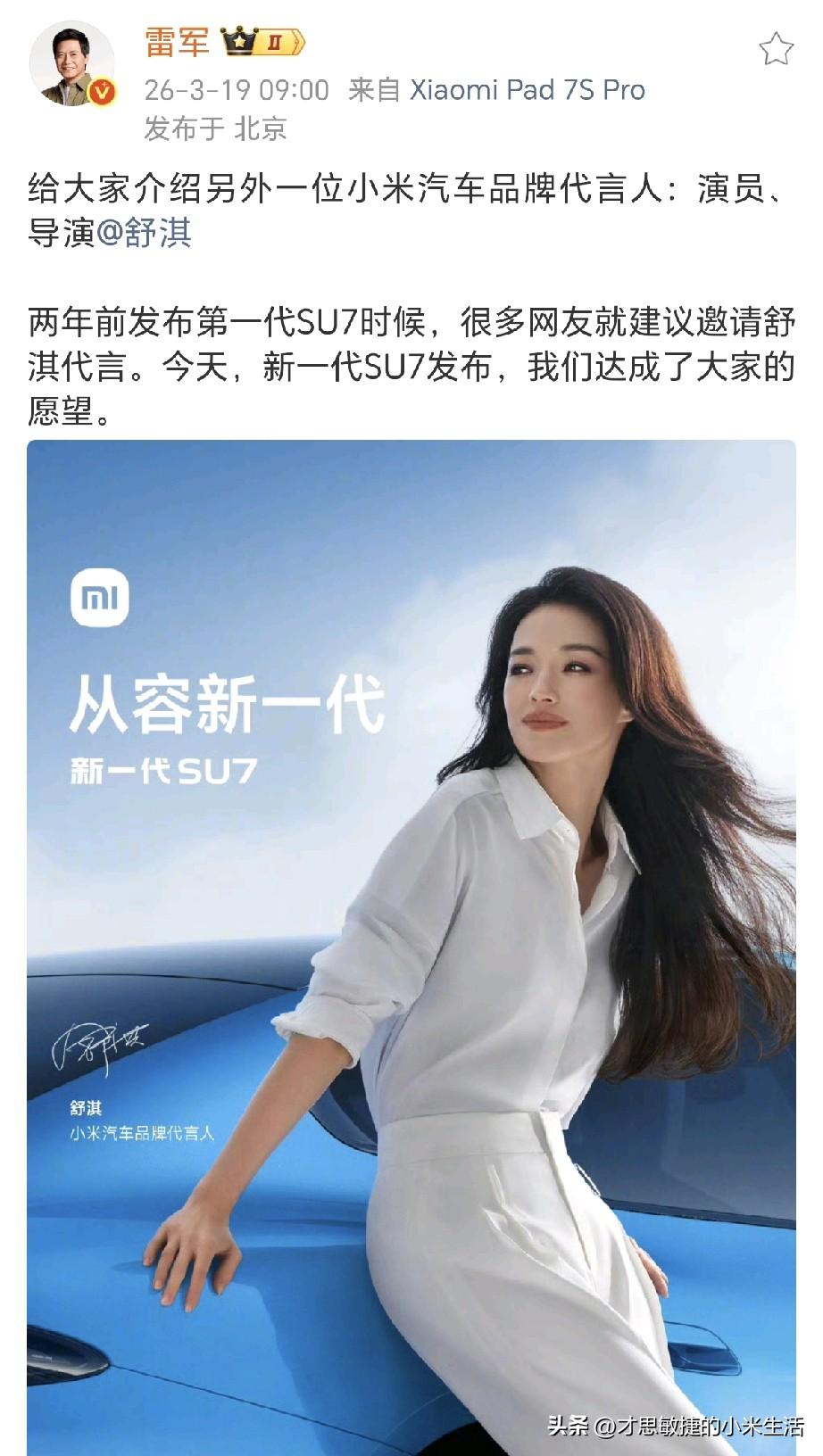 雷军听劝了,果真邀请到了舒淇做新一代小米SU7的代言人了! 今天雷军正式官宣演员、导演舒淇成为小米汽车品牌代言人, 在两年前发布第一代SU7时候,广大网友就建议邀请舒淇代言。雷总称,今天,新一代SU7发布,我们达成了大家的愿望。 ​​​ 同时舒淇也发了动态表示,没错,我代言小米Su7啦。选择小米Su7当然是因为它颜值高又很聪明,让人非常有安全感。谢谢苏七这个名字连接起跟我的缘分,也希望你们能喜欢我代言的新一代苏七! 咱有一说一,好看的人配好看的车,这份松弛感太戳人,舒淇的国际质感、松弛气场与小米SU7高端定位契合,兼顾科技感与情感共鸣。让我们一起和新一代SU7,向最好的时光,从容出发吧!期待今天晚上的发布会,今晚友商们又睡不着了,你们觉得呢?