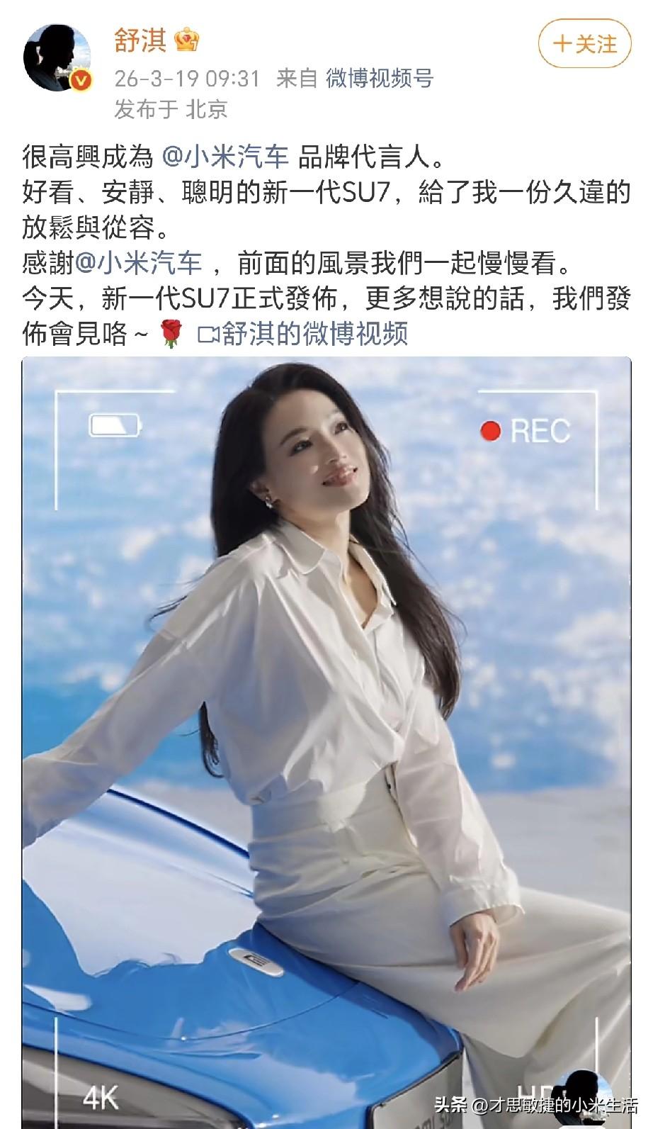 雷军听劝了,果真邀请到了舒淇做新一代小米SU7的代言人了! 今天雷军正式官宣演