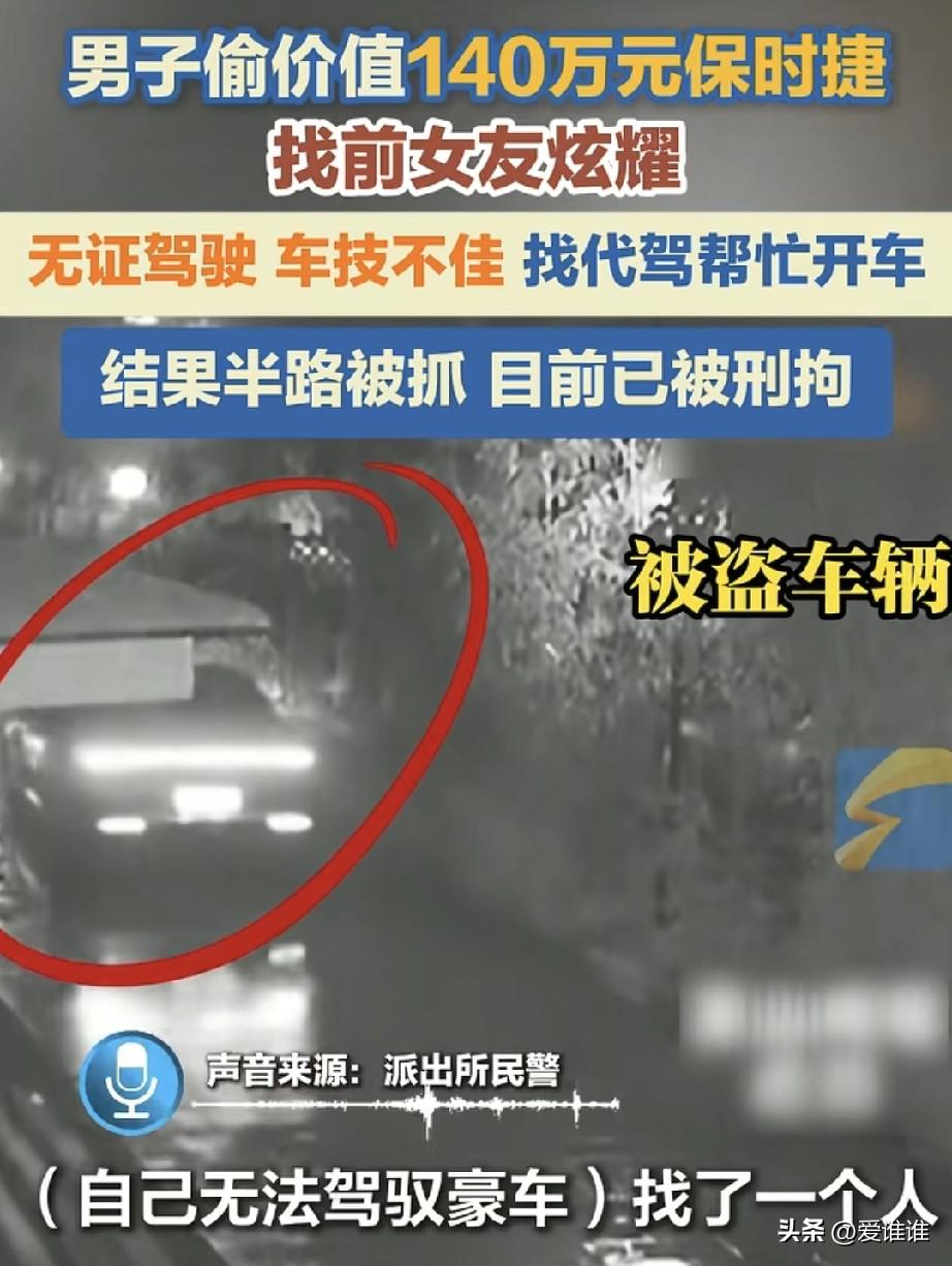 “真够蠢的!”杭州,男子路边偷盗价值140万元保时捷,想去前女友面前炫耀一番,结果不会开这车,于是叫了个代驾送自己过去,没想到车开到半路就漏了馅! 男子毛某,在杭州拉车门碰运气,结果真让他找到一辆没锁的保时捷,钥匙还插在车上,这辆车价值140万。 一般人偷了豪车肯定躲着走,但这大哥脑回路清奇,他居然想开去台州找前女友炫耀,可他自己没驾照,不会开,于是干了一件更绝的事:叫了个代驾。 代驾司机哪知道这是赃车,一脚油门就往台州开,结果失主发现车没了立刻报警,警方两小时就锁定了位置,直接在半路就把人车找到了,当时毛某某还坐后排美着呢,警察就来了。 网友全看傻了:这智商还偷车,先不说现在满街摄像头,光叫代驾送自己去炫耀就够蠢的,有人替代驾捏把汗,接单赚钱结果拉着贼跑了几百公里,还有人说车主心太大,这么贵的车钥匙放车里,这不是白送给别人吗。 毛某某炫耀不成,直接把自己送进去了,这教训够深刻的,想在前女友面前撑面子,靠偷,最后只会更丢脸!