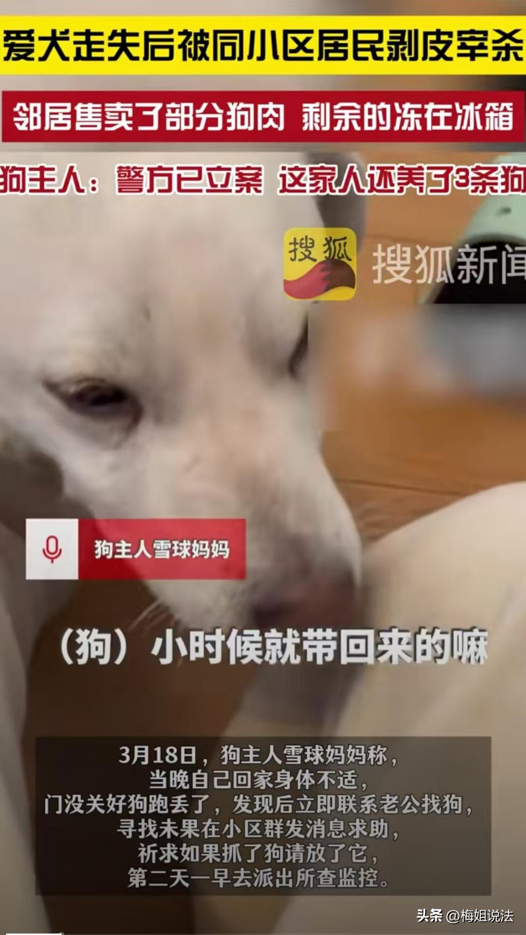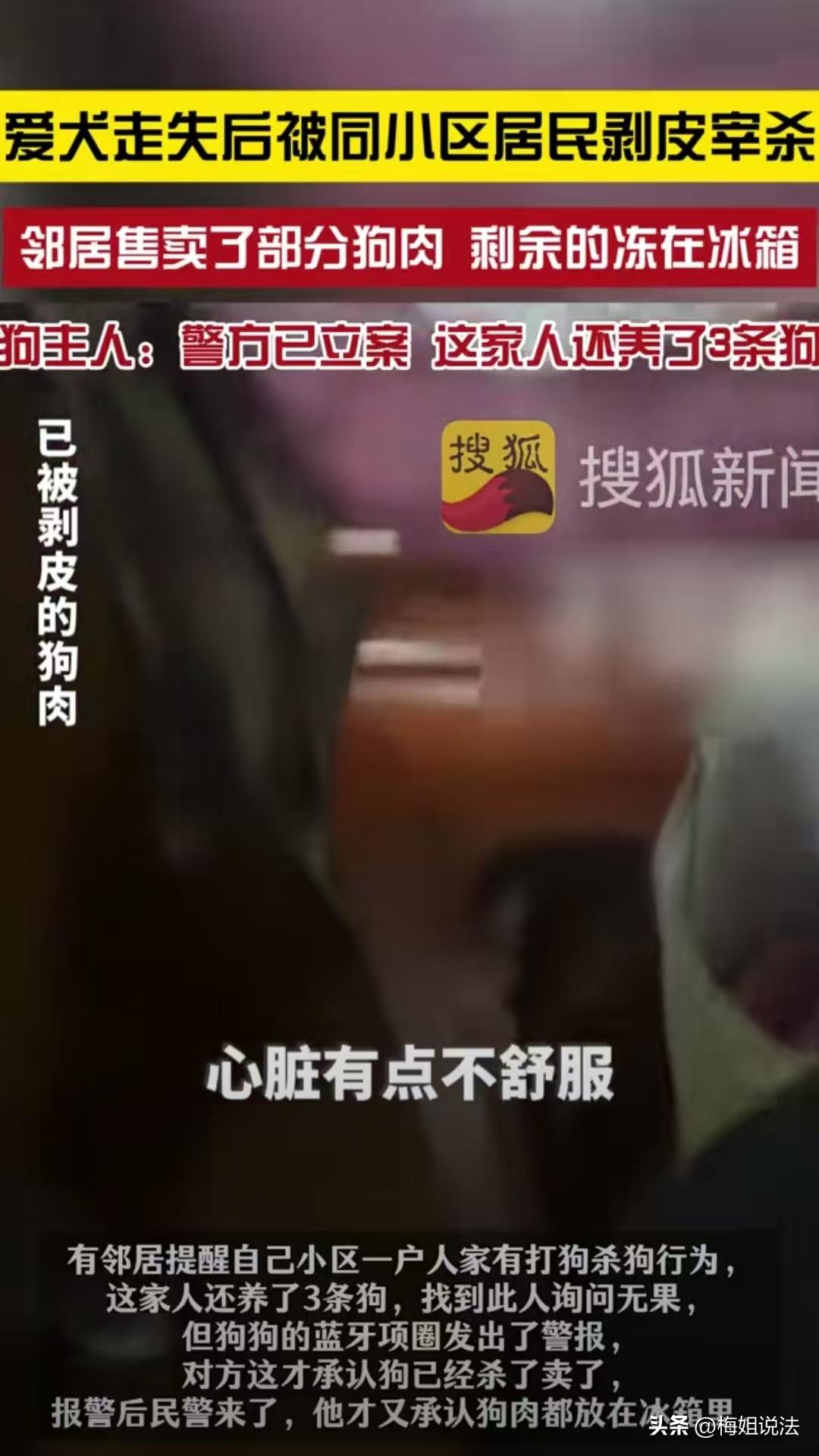江苏昆山,女子没关好门,家里的狗跑了出去,结果被邻居老人剥了皮把肉卖了。女子和丈夫找到他家,邻居还不承认,邻居女儿的男朋友甚至摔了三个啤酒瓶威胁。更可气的是邻居全程没有道歉,反而一副你能把我怎么样的态度。 这只被邻居剥皮的小狗叫做雪球,它的主人是一对夫妻,夫妻俩是在2020年开始养的它。 据雪球的女主人讲,当时小狗到她家的时候还是只幼犬,夫妻两人一点一点把它养大,和它的感情很深。 3月11号的晚上,女主人下班的时候,身体感觉不舒服,进来的时候疏忽了,没把门关好就回房间躺着了。 过了一会,女主人发现雪球不见了,就赶紧查看雪球的定位,结果发现它一直在小区5栋附近。 女主人赶紧叫老公出去找,但是她老公到5栋旁边找了半天也没发现雪球的踪影。 她在小区群里发了个红包,询问邻居,有没有人看到她家的狗,如果被谁逮到了,希望邻居把狗放开,让它自己回家,但是一直没有人回复她。 第二天,有个邻居私信她,说5栋里面住了一个老头,经常打狗吃。 女子和丈夫赶紧找到这个邻居家,问他有没有看到自己的狗,但是老头说没看到。 这时候女子的丈夫按了一下和定位项圈连接的蓝牙按钮,老头家里面发出滴滴滴的警报声,女子和丈夫看到了雪球脖子上的项圈,就在老头家里。 俩人询问他家的狗去哪儿了,老头才说,狗已经被他剥了皮,杀了肉,肉已经卖掉了。 当时女主人就感觉天塌了,脚底下直发软,她的丈夫气得立即报了警。 民警到场后仔细盘老头,他才说了实话,说狗肉卖了一部分,剩余的被他冻在冰箱里,还拿出了小狗的皮。 当时老头低着头一言不发,既没有道歉,也没有丝毫要道歉的意思。 女子和丈夫气的吃不下饭,睡不着觉,于是再次找到老头家里,要求他给个说法。 这次,老头没有了上次低头垂目的样子,而是雄赳赳气昂昂的从屋里边走出来,一副你能拿我怎么样的态度。 夫妻二人要求老头道歉给个说法,结果老头女儿的男朋友从屋子里冲了出来,向夫妻二人摔了三个酒瓶子,态度非常嚣张。 立案后,民警组织双方进行了调解,但是没有调解成功。 有人说狗是自己跑出去的,这就说明是无主的流浪狗,自己不看好不文明养狗,谁也怪不得。 也有人发出质疑,杀狗难道就要立案吗?狗是自己跑出去的,这又不构成盗窃,卖了狗肉也没多少钱,也不构成不当得利,凭什么立案? 流浪狗伤人和不文明养狗引发冲突的事件时有发生,大家对这些狗深恶痛绝的心情可以理解,但是,老人确确实实违法了。 案发当天,狗虽然是因为女子自己没关好门跑出去的,但它并不是无主的流浪狗。 狗主人自2020年开始饲养,与狗建立了明确的饲养关系,拥有对狗的所有权。 根据《民法典》物权编相关规定,私人对其合法的动产享有所有权。 雪球虽然是一只狗,但是它作为主人的合法财产,受到法律保护。 老人在明知狗有主人的情况下,将其宰杀并卖肉,属于侵犯他人财产权的行为。 根据《民法典》规定,侵害他人财产,应当承担相应的民事责任。 宠物狗和普通无生命的物品不同,它和主人建立了深层次的情感链接,老人偷偷宰掉雪球,对主人的精神造成了极大的损害。 所以,老人应当赔偿狗主人的损失,这个损失包括狗实际上的价值,以及精神损害赔偿。 最后,对于网友们质疑的立案问题,立案并不意味着老人必然会受到处罚。 立案分为行政立案和刑事立案,是司法机关对案件进行初步审查,以确定是否存在违法犯罪事实,并不代表着这种行为必定犯罪,要接受处罚。 虽然老人的行为侵犯了狗主人的财产权,但本案显然不属于刑事案件。 本案进行立案,只是说明民警已经开始对这起案件进行调查,要查明事情的真相,并不是说要对老人进行处罚。 并且,由于目前法律对于宰杀、食用狗并没有明确的禁止性法律规定,所以老人不构成刑事犯罪。 对于城市养狗行为,您怎么看?