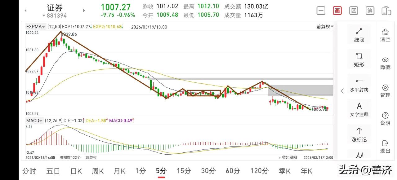 聊聊证券板块(2026.3.19) 今天证券板块上午走的比较恶心,不过下午会有所收复,在短线总体向下的情况下,操作务必要谨慎,搞不好就会幺蛾子出来,昨天再T的朋友也不必担心,最终还是会去1028点附近的,只不过它会走很多笔迂回后才会到达。 1.从30分钟图一上看,总体还是在中枢的延伸过程中,并没有出现三卖或三买,所以此处的操作级别依然是5分钟,意思是说,5分钟走好就可以操作,走坏必须要退出来,其实根据缠论理论,在横盘震荡期间,最好以观察为主,因为这里的操作级别很小,很难出现盈利的情况,而且还耗时费精力,只有离开震荡区间出三卖或三买,才会有比较好的操作机会。在之前的文章中多次讲过,此处会逐步演化成一个周线三卖结构,它在此处会不断的来回震荡,所以昨天再T没成功的朋友,可以耐心等着,还是会让你盈利出来的。 2.从5分钟图二上看,下午有望向上反弹,但上方有二个缺口,可谓是压力重重,是很难突破上去的,更多的是走两个同向的5分钟中枢扩张成一个个30分钟中枢,等形成盘整背驰后,才会有望修复上方两个缺口,所以此处还会小幅震荡一段时间后才会向上突破至1028点。 总之,最后一跌还没到来,操作上可考虑持5成仓位继续等待。分享今日之感悟 分享你的今日随笔