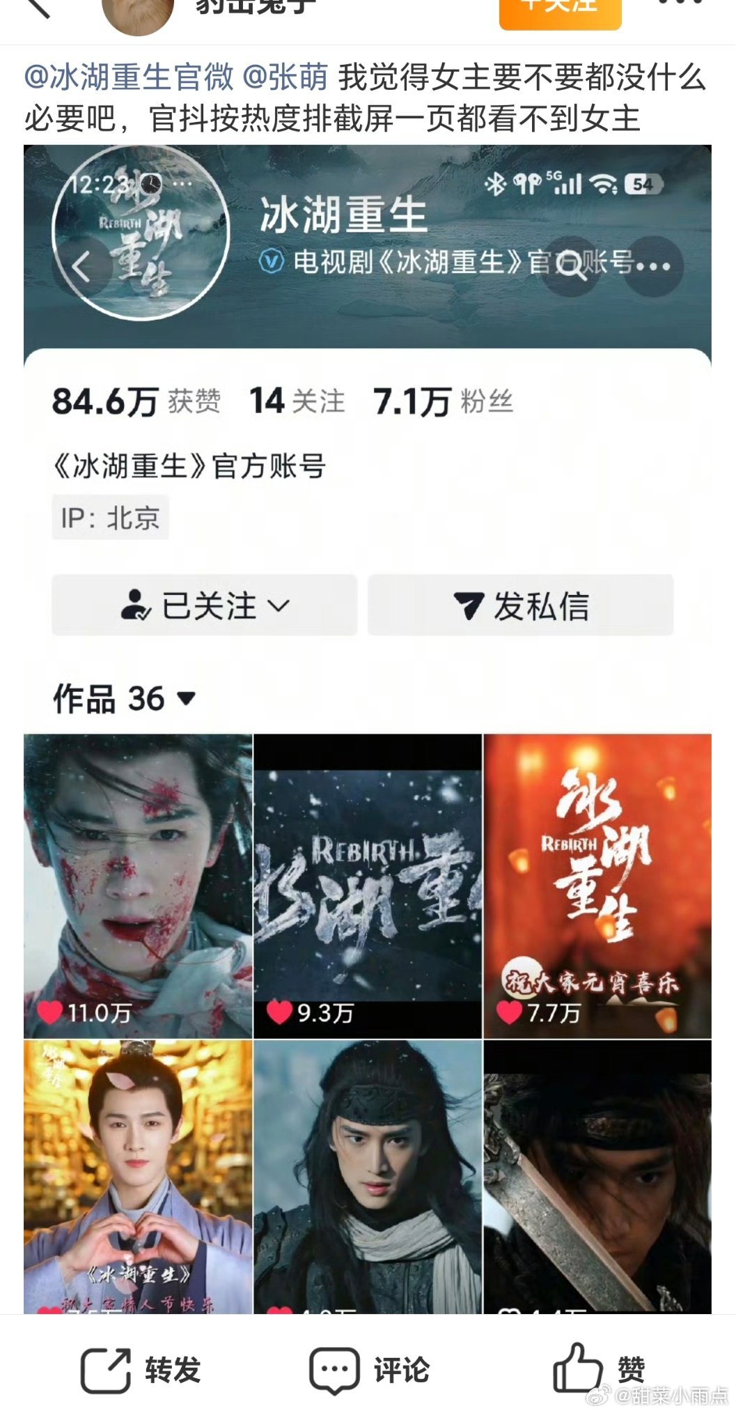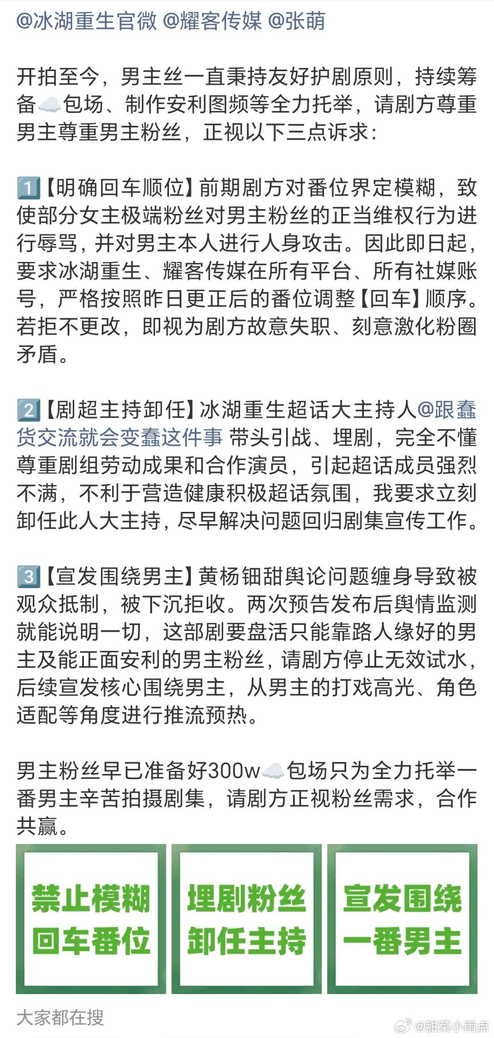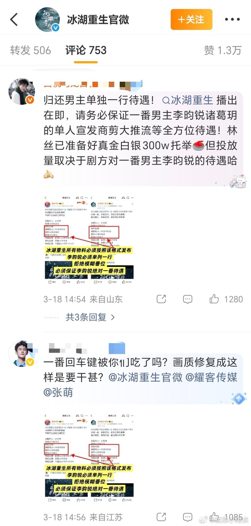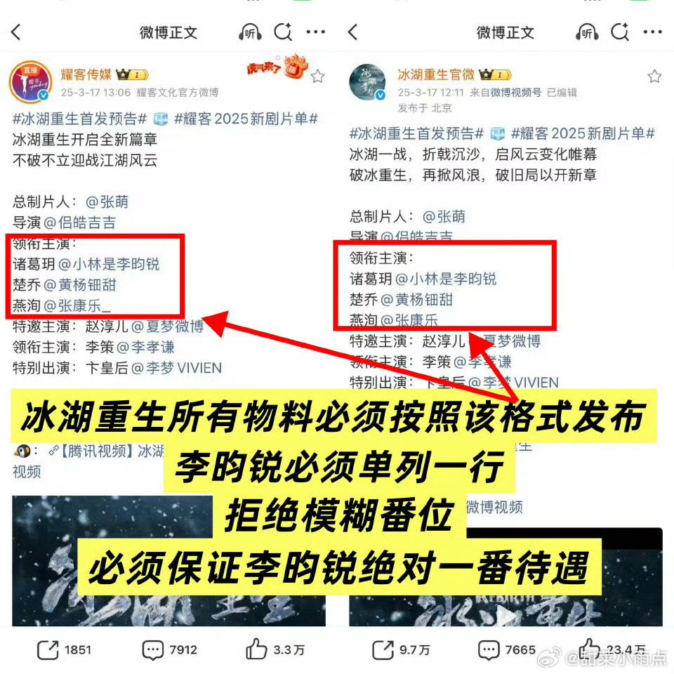 李昀锐粉丝在《冰湖重生》官博下维权,称一番必须单列一行,控诉女主大粉埋剧。黄杨钿甜粉丝发微博称剧官抖没有女主…到底是谁的锅🤔