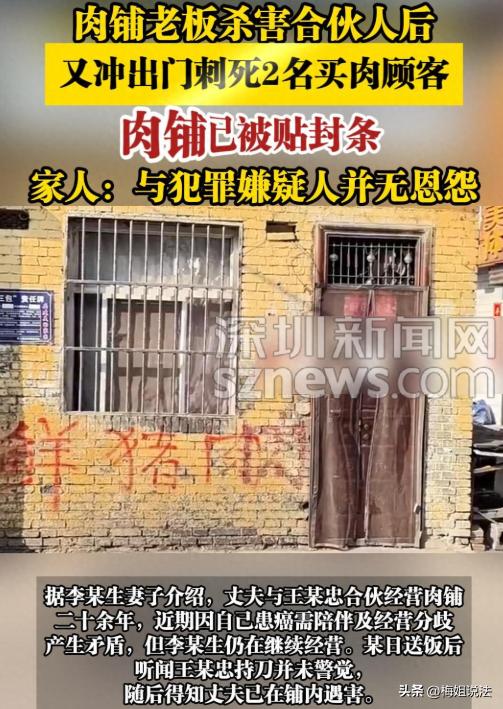 山西晋城,两名男子合伙开肉铺20多年,因一人患病想退伙起纠纷,一男子先杀合伙人,又杀两名无辜顾客。家属公开详情,盼严惩凶手并索赔,目前案件待开庭。 26年3月,距离此事,已经过去整整6个月了,3户受害人家属终于忍不住公开了案件细节。 没有华丽的表述,全是控诉,盼着法院能严惩凶手,还死者一个公道,同时提出了合理的赔偿要求。 夺走3条人命的根源只是一场合伙纠纷。王某忠和李某生,两人都是晋城本地人,从30出头就一起合伙开肉铺,算到2025年,整整23年。 23年里,两人租金平摊,每月各出3500块,刚好凑够7000块的房租。 轮流看店,每人看15天,不分节假日,哪怕过年也只是互相换半天班,周围街坊邻居都看在眼里,没人不夸他俩配合得好。 23年的情谊,抵不过一场病、一笔钱。 2025年4月,李某生总觉得脖子不舒服,去医院检查,确诊了甲状腺癌。 不算后期康复,光手术费就需要8万多,更别说他妻子常年体弱,也需要人照顾,家里的开销一下子压得他喘不过气。 李某生不是想退伙,只是想暂时停一停生意,先治病、照顾妻子,等病情稳定了再回来继续合伙,他跟王某忠说了自己的想法,本以为相处23年的老伙计能理解,可王某忠的反应,让他心凉透了。 王某忠不同意,坚决不同意,他的理由很简单,肉铺最近经营困难,每月净利润也就8000块左右,两人平分,每人4000块。 他女儿要结婚,婚房装修需要20万,他自己手里只有12万,还差8万,全指望肉铺的收入填补。 李某生要是停生意,他一个人根本忙不过来,肉铺就得关门,他的装修钱就没着落了。 更过分的是,王某忠不光不让李某生停生意,还多次要求李某生退伙,甚至提出,退伙可以,之前合伙的本金只能退一半,因为肉铺现在不景气,亏了钱。 李某生怎么可能同意?他妻子治病每月要吃药、复查,光药费就1200块,加上生活费,每月至少需要3000块,肉铺的收入是他唯一的指望,退伙拿一半本金,根本不够支撑家里的开销。 矛盾,就这么攒下来了。 从4月到9月,5个月的时间,两人吵了不下10次,每次都吵得面红耳赤。 王某忠觉得,李某生就是故意跟他作对,明明知道他急需钱,还故意拖着不退伙。 李某生觉得,王某忠太绝情,23年的情谊,连他生病都不肯体谅,眼里只有钱。 没人知道,王某忠心里的怨气,已经攒到了临界点。 他每天都在想,女儿的婚房装修不能拖,李某生又不肯退伙,自己走投无路了。 2025年9月4日,早上5点多,天还没亮,王某忠就从家里拿了一把水果刀,藏在身上,去了肉铺。 李某生比他早到10分钟,正在整理肉案,准备当天的生意,根本没注意到王某忠的异样。 王某忠走进肉铺,没说话,眼神空洞,直勾勾地盯着李某生。 李某生抬头看了他一眼,刚要开口问他怎么了,王某忠就冲了上去,手里的水果刀直接刺向李某生的胸口。 李某生没来得及喊一声,就倒在了肉案旁,王某忠站在原地,看着倒下的李某生,没有丝毫慌张,反而眼神变得更加疯狂。 就在这时,高某玲带着侄子高某阳来买肉了。 高某玲是附近的老顾客,经常来这家肉铺买肉,那天早上,她想着买些排骨给家里老人补补,就带着15岁的侄子高某阳一起,压根没发现肉铺里的异常,也没看到倒在地上的李某生。 王某忠听到脚步声,回头一看,看到了高某玲和高某阳,不知道是被刺激到了,还是疯魔了,他突然冲了过去,二话不说,一刀就刺中了高某阳的颈部。 高某阳才15岁,根本没反应过来,当场就倒在了地上,没了呼吸。 高某玲刚要尖叫着跑出去,王某忠又追了上来,朝着她的腹部连捅两刀,高某玲倒在地上,挣扎了几下,也没了气息。 短短几分钟,3条人命,就这样没了。 王某忠没有逃跑,就在肉铺里坐着,直到有人发现异常,报了警,民警赶到现场,将他当场抓获。 家属公开的细节里,还有赔偿的相关诉求。 23年的合伙情,怎么就走到了这一步? 其实,没人知道,王某忠在案发前,已经向亲戚借了5万元,还是不够装修钱,他也曾找李某生协商,说让李某生先退伙,等他装修完,再让李某生回来,可李某生因为妻子治病,坚决不同意,两人的矛盾才彻底激化。 直到现在,案件还在等待开庭,王某忠被关押在看守所。 3户受害人家属,每天都在煎熬中度过,盼着开庭的那一天,盼着能得到一个公正的判决,盼着凶手能受到应有的惩罚。 根据《刑法》规定,明知自己的行为,会导致他人死亡,仍故意实施,构成故意杀人罪,且杀害3人,属于情节特别恶劣。 王某忠提前携带刀具,属于有预谋犯罪,并非临时激情,不能从轻处罚,大概率会判处死刑。 23年合伙情,终究败给了金钱和冲动,3条人命,3个破碎的家庭,到底是谁的错? 王某忠的绝情,李某生的固执,还是现实的无奈?您对这件事有什么看法呢?