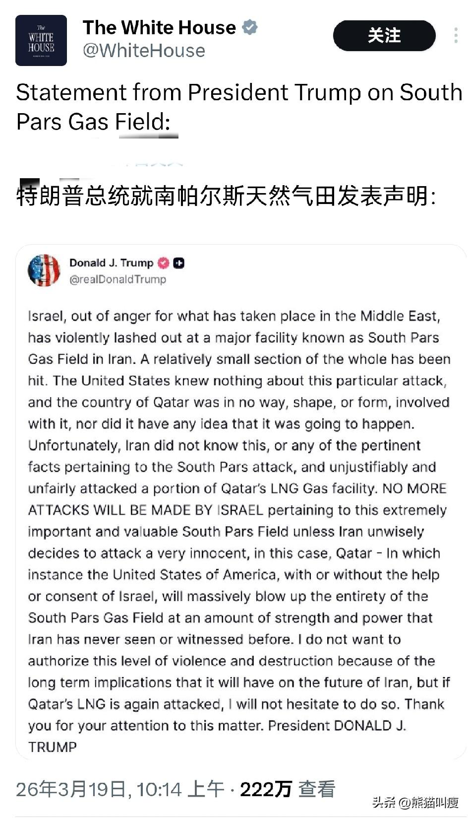损友间的第一次决裂?特朗普发文宣告天下,自己对以色列攻击伊朗能源设施【并不知情】。 伊朗的南帕尔斯天然气油田,全球最大,以色列选了个好目标。伊朗宣布“以眼还眼”全面攻击海湾地区能源设施。 特朗普在声明中说自己并不想这么做。然而声明最后却又威胁说【会用伊朗从来没有见过的强大力量,完全摧毁南帕尔斯】。可几天前美国媒体刚报道美国以色列可能对伊朗能源设施进行打击,双方正在密切协作。 没人能看得懂他们在干嘛,很明显他们对自己要做的事情,根本没做过准备。搁这跳双簧呢。