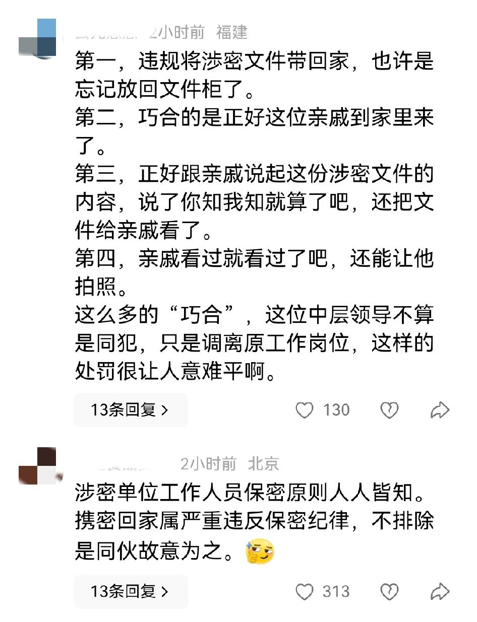 “家人不会泄密”?干部携密件回家酿大祸,亲属早已被境外策反 某机关一位张干部年纪不大,职位不低,竟把三份密件揣回了家。说是加班用,实则是图省事;更糟的是,还让亲戚瞧了、聊了。那亲戚姓李,表面是自家人,背地里早被境外势力收买,趁机偷拍,转手就发到了国外。一纸密文,没毁在敌营,倒折在自家炕头。 这事儿听着荒唐,却不是头一遭。如今有些干部,上班时西装笔挺、规矩十足,一下班便松了裤带,以为回家便是“自由天地”,老婆孩子面前啥都能说,亲戚朋友跟前啥都能露。殊不知,敌人不在城外,在饭桌上;间谍不穿黑衣,偏披着亲情的外衣。这些年,多少泄密案,根子不在办公室,而在客厅、厨房、微信家群里。人情味浓了,警惕心淡了,国门便从后院悄悄开了缝。 张某未必存心卖国,不过是懒、是傲、是信错了人。他觉得“自家人不会害我”,却忘了国家秘密不是家传菜谱,不能随便端上桌。保密法不是挂在墙上的年画,是刻在骨头里的规矩。你图一时方便,国家就可能吃十年苦头。 这年头,坏人不总在胡同口晃荡,有时就坐在你对面,端着碗热汤,叫你一声“哥”。 真正的忠诚,不在口号里,而在关灯锁柜、闭口不谈的日常里。国家安全,不是将军的事,也不是特工的活,是每个拿过红头文件的人,夜里多一分清醒,嘴上多一道门栓。 家是最小国,国是千万家。可若家门失守,国将焉附?守密如守心,慎之又慎,方不负这身衣冠,不付这片山河。 网友热议:第一,违规将渉密文件带回家,也许是忘记放回文件柜了。 第二,巧合的是正好这位亲戚到家里来了。 第三,正好跟亲戚说起这份涉密文件的内容,说了你知我知就算了吧,还把文件给亲戚看了。 第四,亲戚看过就看过了吧,还能让他拍照。 这么多的“巧合”,这位中层领导不算是同犯,只是调离原工作岗位,这样的处罚很让人意难平啊。 评论区大家聊聊自己的看法军事情报泄密案