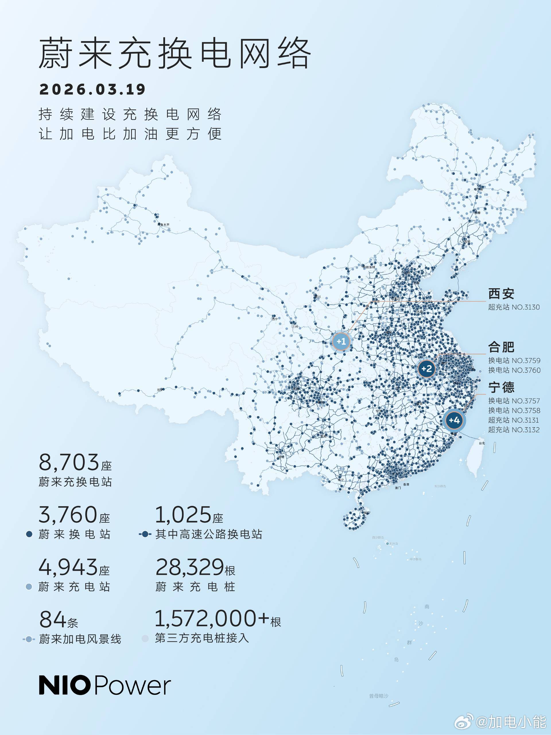 3月19日,NIO Power 7站上线NO.3757 蔚来换电站 | 宁德周宁旅游集散中心NO.3758 蔚来换电站 | 宁德屏南国宝大道NO.3759 蔚来换电站 | G4212合安高速陈埠服务区合肥方向NO.3760 蔚来换电站 | G4212合安高速陈埠服务区安庆方向NO.3130 蔚来超充站 | 西安雁塔东等驾坡NO.3131 蔚来超充站 | 宁德周宁旅游集散中心NO.3132 蔚来超充站 | 宁德屏南国宝大道持续布局-让加电比加油更方便