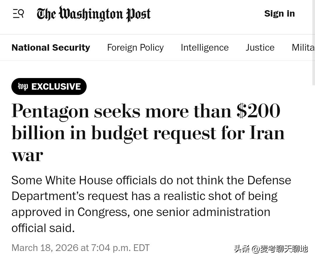 据《华盛顿邮报》报道,美国军方就伊朗战争争取追加2000亿美金的军费开支。 伊朗外长阿拉格齐对此讽刺说:“这场强加于伊朗人和美国人身上的选择之战才进行了三周。这2000亿美元只是冰山一角”。阿拉格齐乘机揶揄美国人即将被这项价值万亿美元的“以色列优先税”冲垮美国经济。 美国确实发生了疲态,部署在对伊朗作战的“福特”号航空母舰发生火灾后,预计将在克里特岛进行临时停靠。“福特”号航母已在海上航行近九个月,漫长的任务引发了人们对船员疲劳和作战准备状态的担忧。 该航母搭载超过 5000 名人员和 75 多架飞机,仍然是美国军事行动的核心,自 2 月下旬行动开始以来,美军已对数千个目标进行了打击。