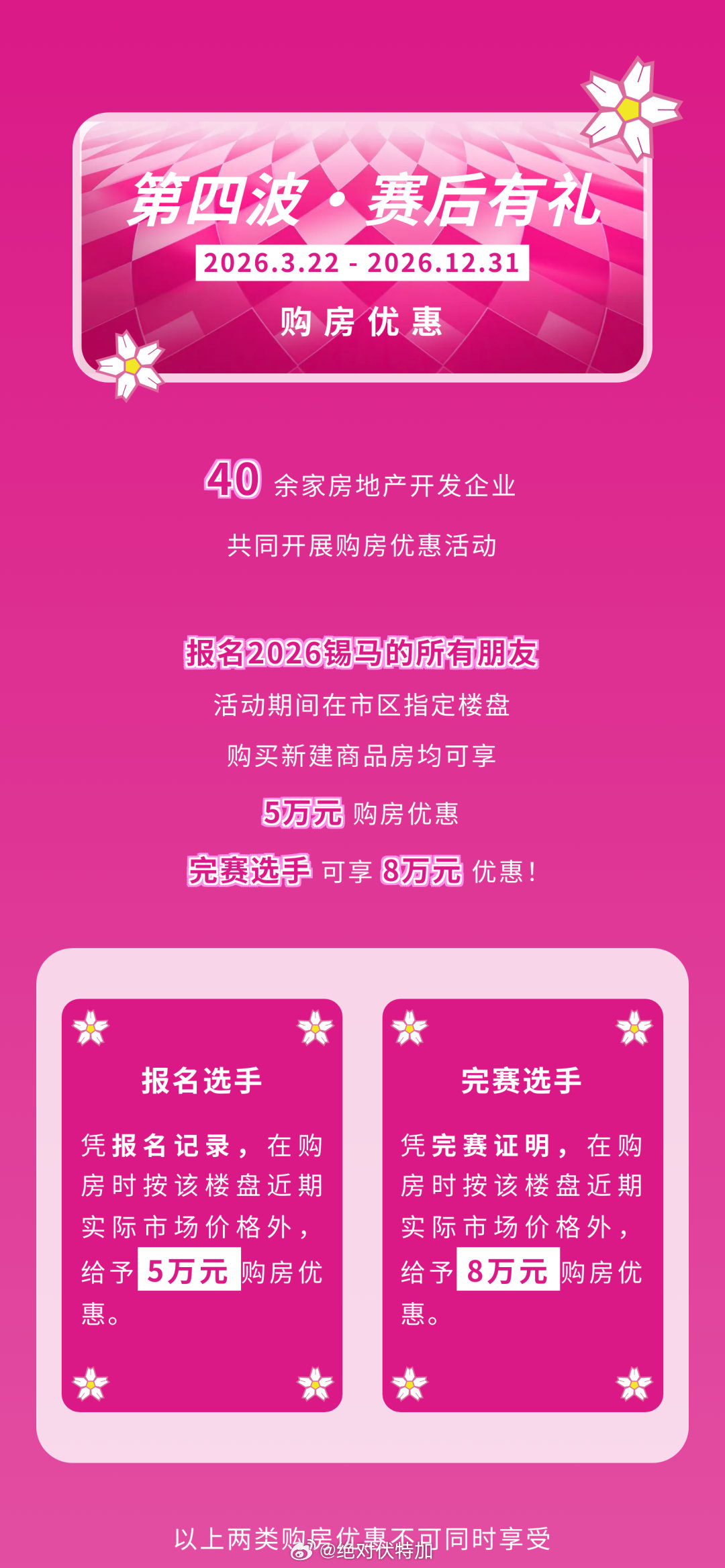 无锡马拉松完赛选手购房优惠8万 参加无锡马拉松买房减5万 报名和完赛2026无锡马拉松的跑者,在活动期间在市区指定楼盘购买新建商品房均可享受优惠5-8万元的福利。看了下无锡房价,新房每平两万二,如果有五平米以下的小户型,那优惠力度还是很大的。