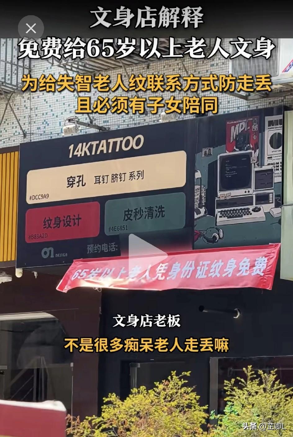 广东一纹身店挂横幅:65岁以上老人免费纹!店主否认玩梗,真相曝光太扎心! 3月17日,广东揭阳一家纹身店挂出大红横幅,65岁以上老人凭身份证免费纹身,瞬间刷爆全网,吵翻了天! 为啥要给老人免费纹身? 店主一句话让人破防:很多阿尔茨海默病老人,手环、号码牌戴了就丢,一出门就找不到家。他想把家属电话纹在老人身上,永久不掉,真走丢了,好心人一眼就能联系上家人,而且必须子女陪同才给纹。 这事一出,网友直接分成两派吵疯了。 支持的人说: “比起走丢,纹身算啥?只要家属愿意,这是救命的好事!” “作为一名救援队队员,用我的角度来看,真的很实用!” “刺青回归了最原始的用途:辨认族人!” “对智力障碍孩子也很实用,这种也是高需求人群,他们可不配合戴定位器!” “第一次觉得纹身是好东西!” “刚看字觉得老板搞笑,听到老板说的话觉得真的很好有用!” 反对的人也有理: “纹身伤皮肤,老人容易感染;还伤尊严,等于给老人贴个“失智标签”,隐私也不安全。” “子女陪同,筛选糖尿病和疤痕体质的老人!” “感觉对人文尊重不太好。” 医生也出来提醒:失智老人纹身可能受惊吓应激,最好还是靠家人陪伴、定位手表这些更稳妥。 其实深圳、东莞早有纹身店这么做过,每次都吵得厉害。 你怎么看?支持给老人纹联系方式吗? 素材来源:荔枝新闻,侵联删!