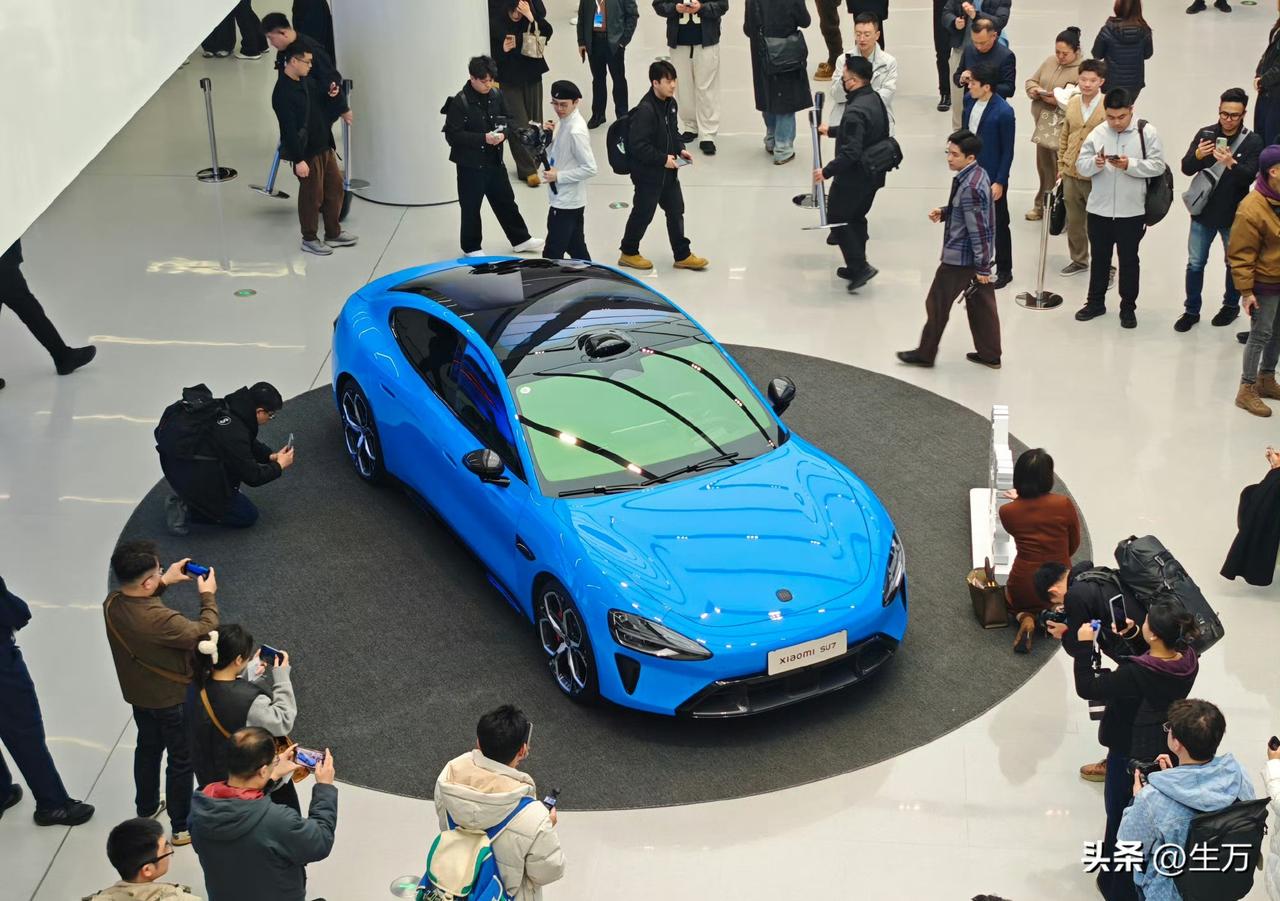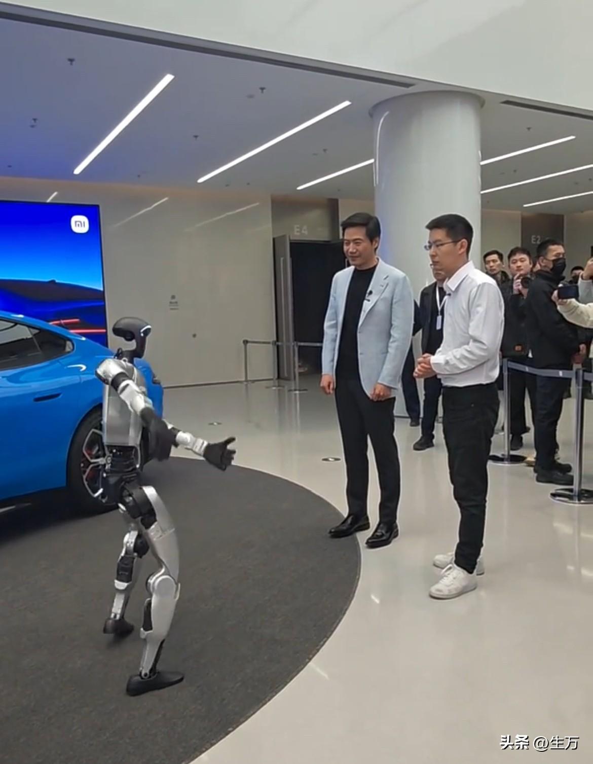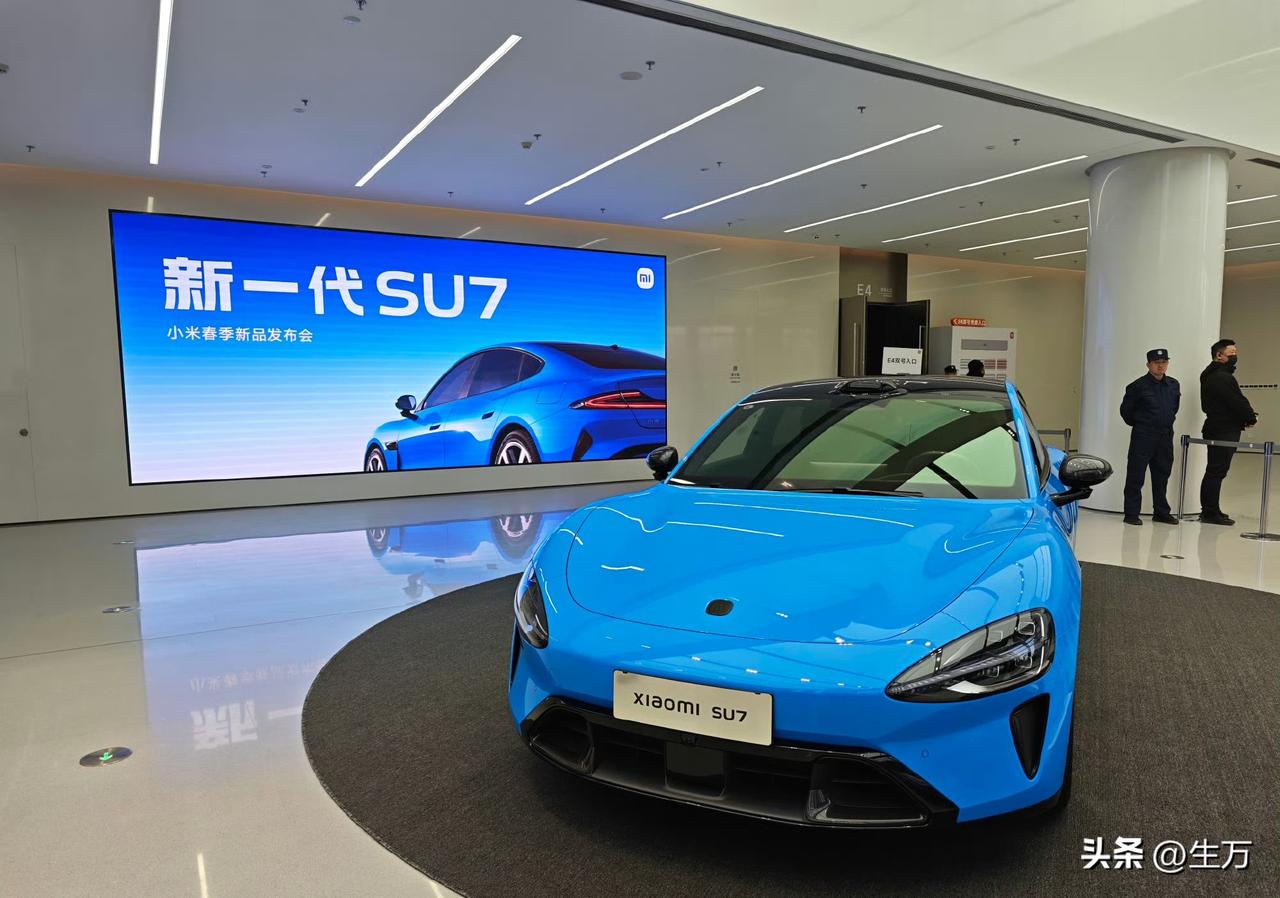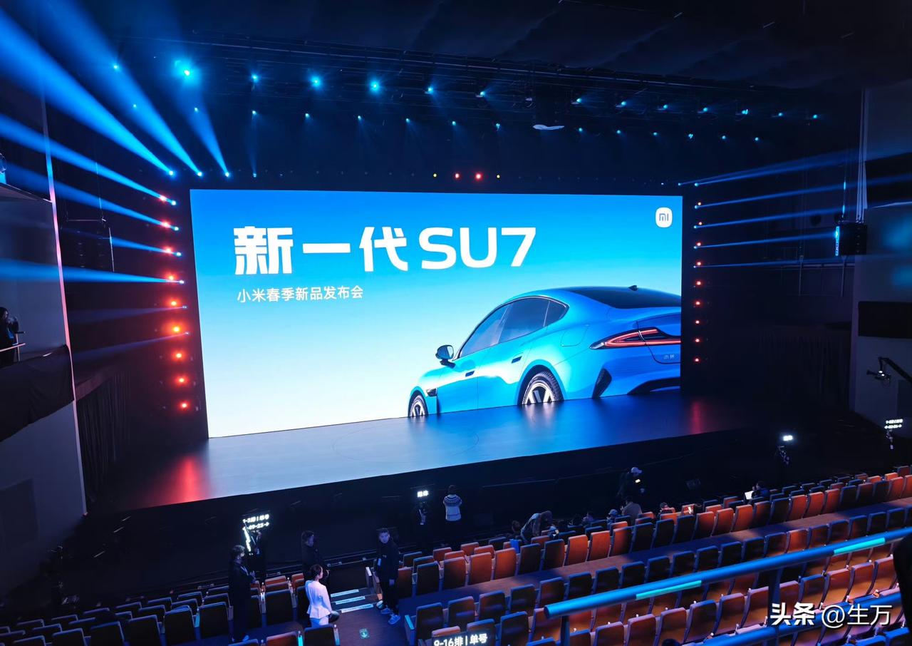 王兴兴也来了,这就是今天晚上新一代小米SU7的现场! 发布会之前,雷军和王兴兴一起在现场,欣赏机器人,现场已经布置得差不多了,整体的基调就是天蓝色,所以小米把这种颜色从车厢到会场布置再到PPT都进行了贯通! 尤其是内场的效果,新一代的小米SU7不论是灯光效果还是人气,整体与第一代小米SU7发布的阵仗还是不一样的! 首先是现场的布局,基本上用的是蓝色的调调,而且连座位上都弄了蓝红交替的这种灯光效果,记得去年小米第一代SUV发布的时候,整体的布局格调不是这个样子。 不知道是不是拍摄的效果,这个场地看起来好像没有去年那么大,不过媒体朋友还是那么多,其实这个车很多人都在线下里里外外的看了,所以今天晚上如何把这个车的优势给讲明白,对于雷军来说与去年情况还是不一样的。 因为在二月份,他基本上做了5场直播,都有关于这个车的信息,所以基本上今天晚上,大家需要看这个在不同的配置上,整体的价格与第一代的区别,尤其是潜在的用户,他们一定对这个车不同的配置有了比较全面的了解,所以他们可能会精打细算。 不知道最终的价格出来之后,会不会出乎大家的意料,我们拭目以待。