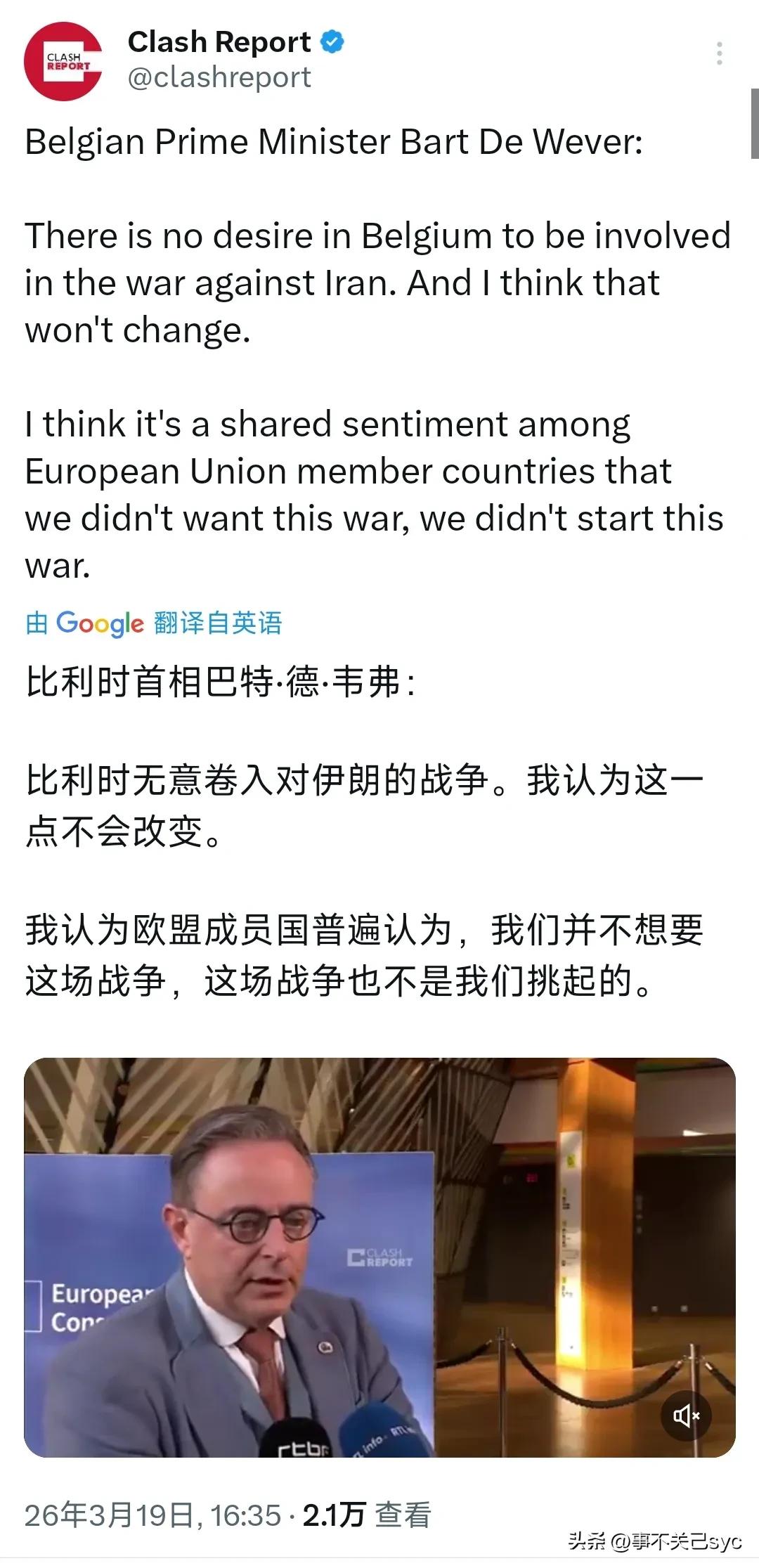 3月19日,比利时首相巴特·德·韦弗接受采访时表示:“比利时无意卷入对伊朗的战争。我认为这一点不会改变。我认为欧盟成员国普遍认为,我们并不想要这场战争,这场战争也不是我们挑起的。” 这是巴特·德·韦弗2026年3月19日抵达欧盟峰会时向媒体明确阐述的比利时的立场。 这一表态并非孤立事件,它反映了欧盟在此次冲突中普遍的 "旁观者"立场。德·韦弗首相明确指出,比利时无意卷入这场战争,并强调这并非由他们挑起。他指出"我认为这一点不会改变",并认为欧盟成员国普遍持有相同观点。事实上,他在3月15日就已回应议会,确认比利时不会加入美国和以色列对伊朗的进攻。 德·韦弗的判断与欧盟整体态度高度一致。欧盟外交与安全政策高级代表卡娅·卡拉斯此前已明确表态:"这不是欧洲的战争",且欧盟"没有兴趣打一场无休止的战争"。她进一步解释,使用武力仅在自卫和获得联合国授权时合法,目前这两点都不适用。 德·韦弗并非孤例,他的言论有一定的代表性。报道显示,荷兰、卢森堡、西班牙、法国等多国领导人均表达了类似立场。其中卢森堡首相的发言尤为精辟:"我们没有发动战争,我们也没有处于战争状态,我们不想被拖入一场甚至没有被征求意见的战争"。 欧盟领导人普遍认为,这是由美国和以色列发起的冲突。西班牙外交大臣甚至直言这场战争是 "非法的" 。尽管存在对伊朗政权的批评,但欧盟认为军事手段并非解决之道。 这也是特朗普强烈抱怨盟友对美国深陷两难,袖手旁观的直接原因之一。