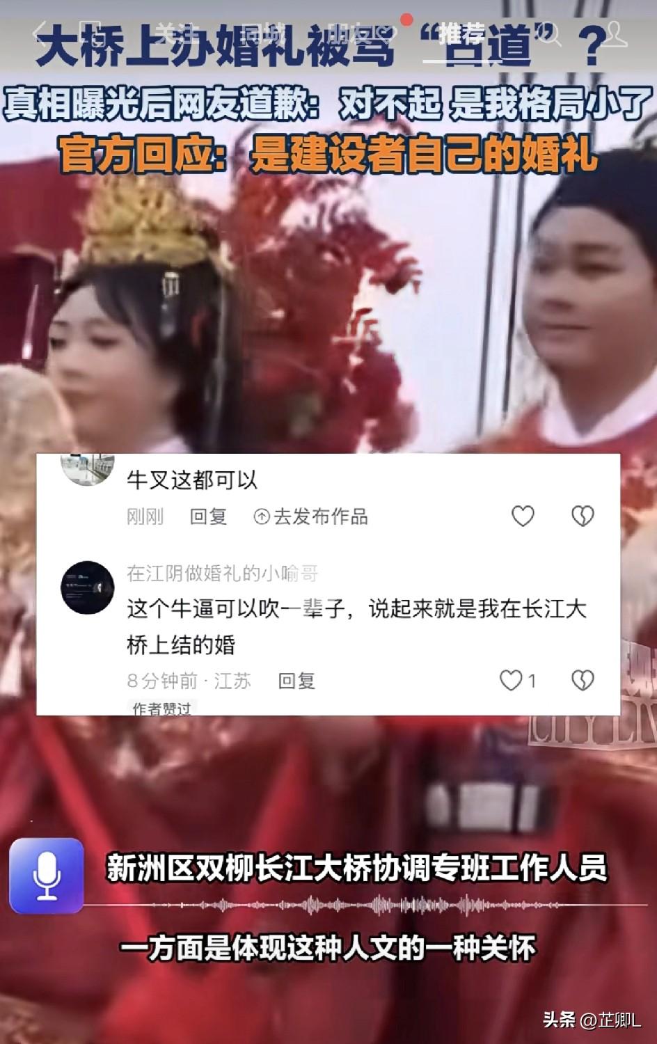 武汉大桥惊现婚礼!刚修好就“占道”?网友气坏了!真相曝光,网友排队致歉:对不是,是我格局小了! 最近,武汉双柳长江大桥要通车的消息火了,但不是因为通车,而是因为有人在上面办婚礼! 视频里一看,好家伙,桥面上真摆了拱门、搞了布置,好几对新人穿着礼服在正中间拍照。 这一下,评论区直接炸锅了,骂声一片! 大家都觉得这事儿办得有点离谱,甚至上升到了“格局”的高度,觉得这是占用公共资源搞秀场。 但是,反转来得太快!官方真相一出,全网排着队道歉:对不起,我的格局小了! 人家解释了:这婚礼是通车前办的,那时候桥是封闭的,社会车辆一辆都进不来,根本不存在堵车或者占道的问题! 而且!这三对新人不是什么普通嘉宾,全是大桥的建设者!是真正为了修这座桥流汗水、熬大夜的工程师和工人们。 他们为了工程进度,耽误了自己的婚期。所以,单位就举办了这么一场人集体中式婚礼,既是人文关怀,也是纪念。 所以,这哪里是占路,这是给自己的勋章加冕啊!用刚建成的大桥,见证自己参与建造的里程碑,这浪漫简直满分! 原来大家骂的是“作秀”,真相却是“致敬”。是咱们普通人格局小了,还以为人家是在搞排场,殊不知这是对建设者最高的礼遇! 说真的,看了视频,心里真是暖暖的。 在钢筋水泥的桥面上,这些把青春留在工地上的建设者们,把自己的人生大事定格在了这里。 这不仅是一场婚礼,更是一种“功成身退”的仪式感。以前觉得浪漫是鲜花烛光,现在才知道,能亲手改变一座城的距离,能在自己一砖一瓦砌起来的桥上宣誓,这才是真·顶配的浪漫! 既然不堵车又有意义,那这波“官宣婚礼”,我给满分! 这波大桥办婚礼,你是怎么看的呢?觉得是浪漫作秀,还是硬核致敬?评论区聊聊你的看法! 素材来源:都市现场,侵联删!