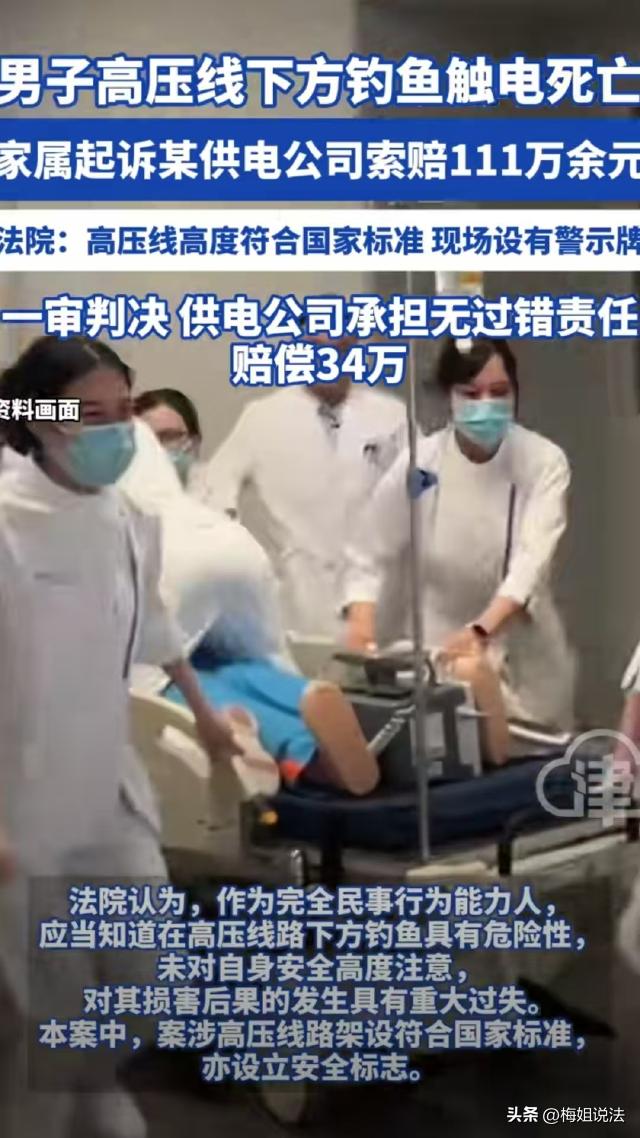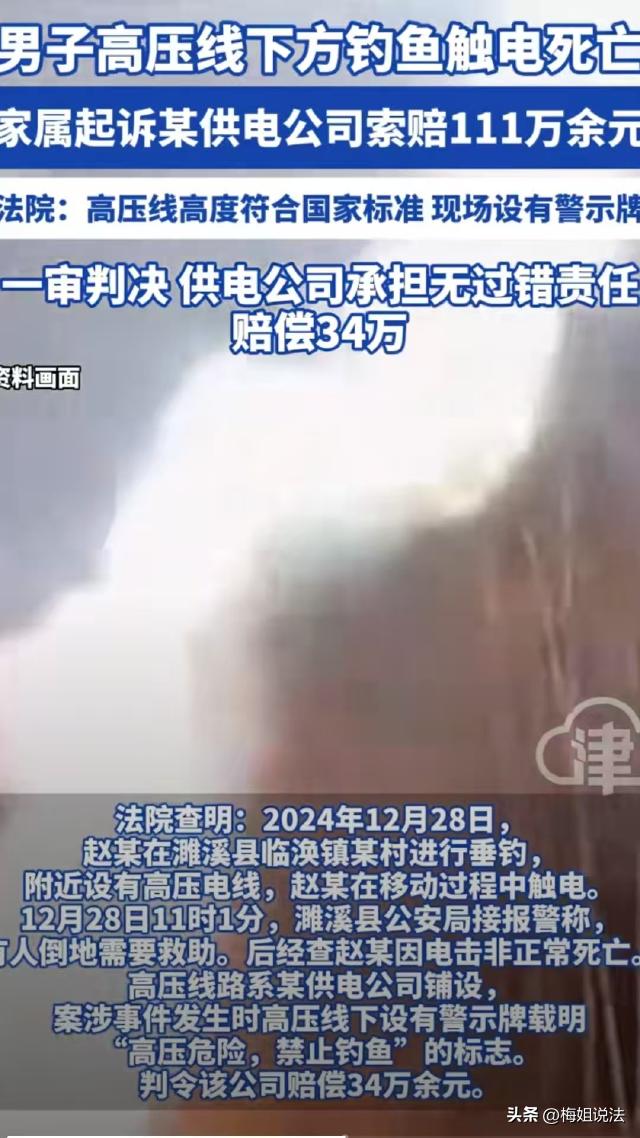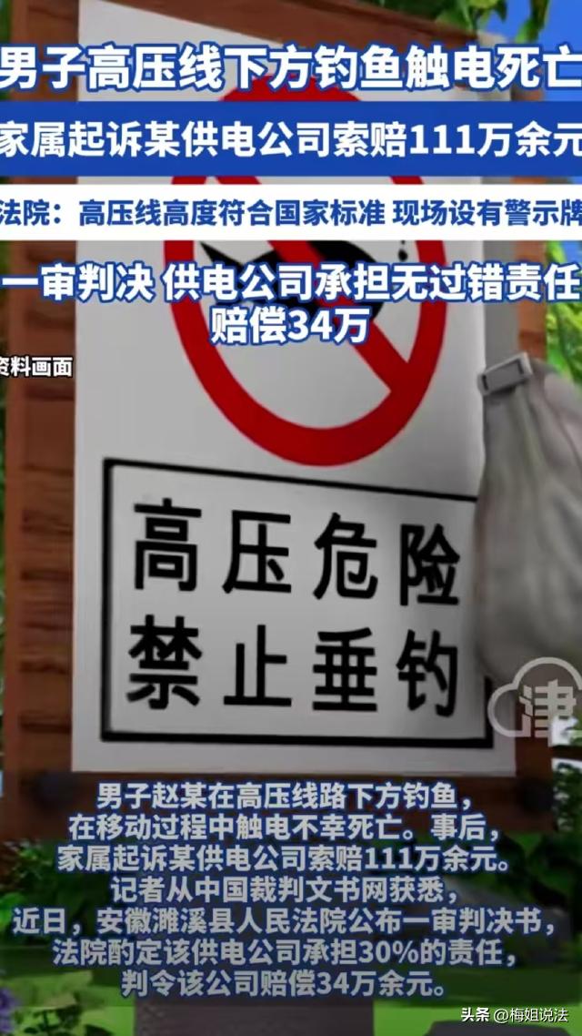 安徽淮北,男子在高压线下面钓鱼,结果甩钩时鱼钩挂到高压线上,人当场就触电倒下了。案发后,家属认为供电公司未尽到安全警示责任索赔111万。然而,一审判决结果却让所有人意想不到。 赵某是濉溪县人,他是个钓鱼佬,平时只要一有空就背着鱼竿到处跑着去钓鱼。 家里人也劝过他不要到处跑,有空在家干点活带带孩子,但是赵某没有其他爱好,休息了只想钓钓鱼清静一会。 2024年12月28日,赵某一大早就背着鱼竿出去了,一直跑到临涣镇某村,才找了个绝佳的钓点。 那个地方地处开阔,有一条不浅的小河。张某将自己的装备拿下来,支上凳子,拿出鱼竿,打上窝料就开始了。 河边竖着高压线杆,旁边还有“高压危险、禁止垂钓”的提醒,但是,赵某作为一个资深钓鱼佬,心里只有找到好钓点的兴奋,对这些提醒视而不见。 赵某在深水区和河边各打了窝子,坐了一会他感觉没有口,又跑到旁边另外一个窝点甩竿,谁知就是这次换地方,引发了大事故。 赵某的竿是刚从河里提起来的,鱼线都是湿的,甩杆的时候,赵某一个没注意,鱼钩挂在了高压线上。 瞬间,电流顺着鱼线和金属鱼竿传到赵某身上,几秒钟之后,赵某瘫倒在地上。 中午11:00左右,附近村民路过看到赵某倒在地上,喊他也没有回应,吓得赶紧报了警,民警赶到时,张某早就没有了生命体征。 经检查,赵某是因触电而亡。 赵某的家属得知赵某出现意外,顿时感觉天都塌了,他们四处打听得知,高压线是某供电公司铺设的。 赵某的家属认为,正是因为他们没有尽到安全警示义务,才导致赵某触电。于是找到对方,要求他们赔偿各项损失,共计1111万余元。 供电公司连连喊冤,称他们在每一个高压线杆下都挂了警示牌,高压线下隔一段距离也都有,“高压危险,禁止钓鱼”的警示标志,而且他们的高压线高度也都符合规定。 经过他们的申请,庭审过程中,办案人员对案发路段的高压线高度进行了测量,测量结结果显示,电线距离地面最矮的是8.12米,距离地面最高的是8.2米。 案发路段的高压电线为35KV,按照规定,35KV的电线在人口密集地区的高度应该为6.5米,人口比较稀少的地区为5.5米,人群难以到达的地区高度为4.5米。 所以按照规定来说,供电公司架设的高压线没有任何问题。 那么,供电公司设置了提醒标志,架设也符合规定,是不是就不用承担责任了呢?并不是这样的。 一审认为,供电公司树立了多处安全警示牌,尽到了安全警示义务,但是这并不是说,他们不用承担责任。 一般来说,产生侵权行为,只有有过错的才需要承担责任,但是有些责任在没有任何过错的情况仍然需要承担责任,这就是无过错责任。 无过错责任原则,又称严格责任原则,简单来说,就是没有过错也要承担侵权责任。 一般需要承担无过错责任的,需要同时满足三个构成要件: 1、有侵害行为; 2、产生了损害后果; 3、具有因果关系。 赵某在高压线下钓鱼,虽然是因为他自己不注意导致的触电,但是,如果没有供电公司架设的高压线,这个损害结果不会产生。所以说,供电公司需要承担无过错侵权责任。 《民法典》第一千二百四十条规定:从事高空、高压、地下挖掘活动或者使用高速轨道运输工具造成他人损害的,经营者应当承担侵权责任;但是,能够证明损害是因受害人故意或者不可抗力造成的,不承担责任。被侵权人对损害的发生有重大过失的,可以减轻经营者的责任。 由上述规定可知,高压线造成别人损失的,经营者必须承担责任。 但是,赵某作为一个具有完全民事行为能力的成年人,明知在高压线下钓鱼有危险,但他无视提醒,最终导致了损害结果发生,赵某自己应该对事故的发生承担主要责任,并且可以相对减轻供电公司的责任。 经核定,赵某的损失费用一共为1161236.25元,一审酌定供电公司承担30%的责任,赔偿赵某家属348370.88元。 来源:津云、红星新闻