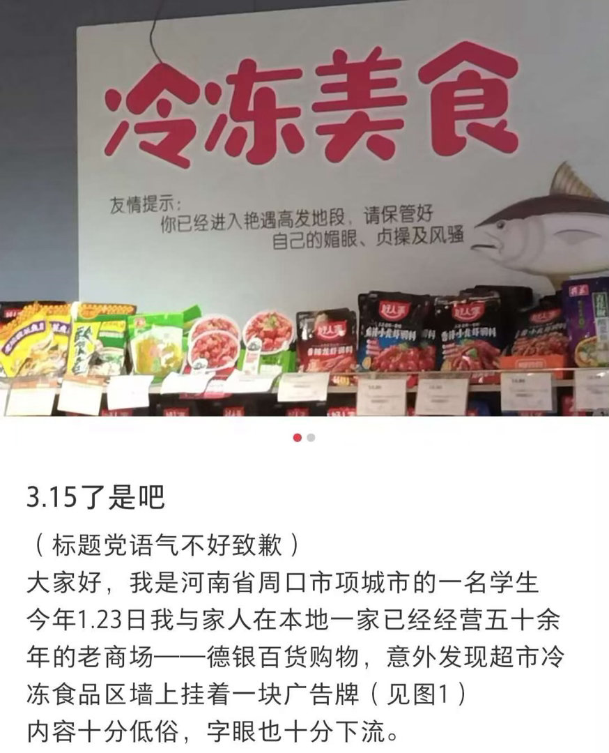 大皖新闻记者注意到,从1月至今,在某社交平台上,有网民发布多条视频、帖文称,位于河南省项城市的德银百货商场超市冷冻区张贴有不雅标语,内容低俗。
