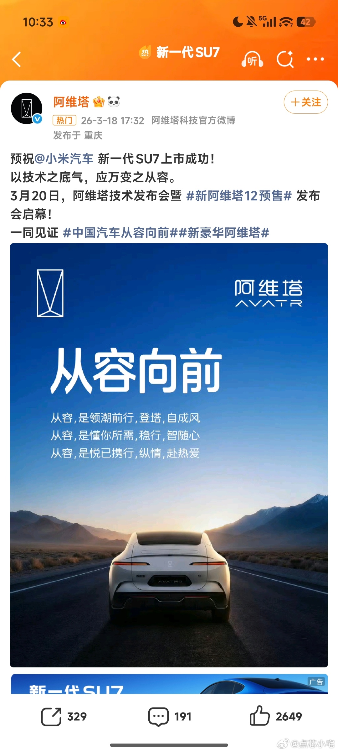 哈哈哈哈,真的没想到阿维塔居然也来了。别的不说,阿维塔和小米应该算是国产新能源车企里颜值第一梯队的吧。