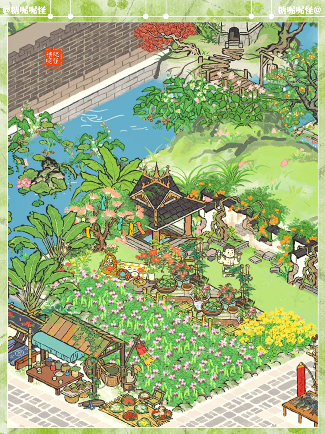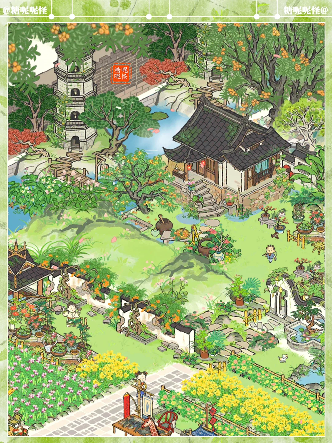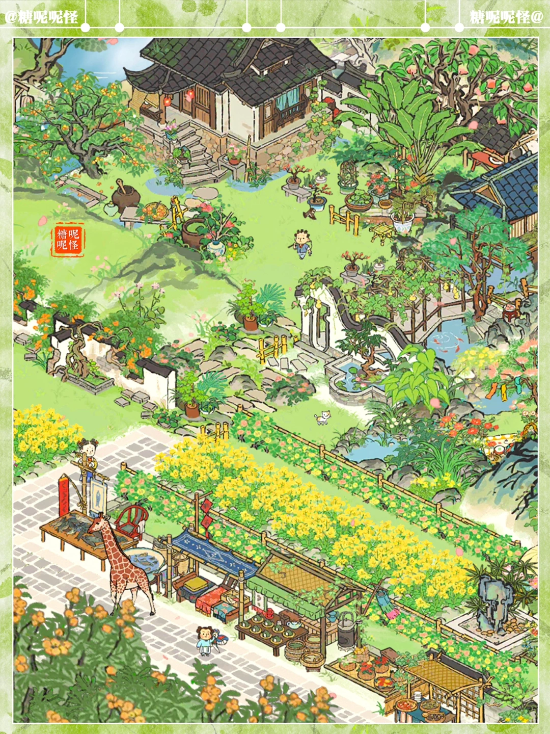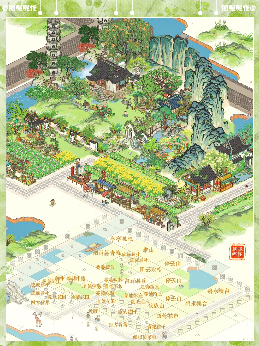 黄梅时节家家雨,青草池塘处处蛙。 建筑:烟雨熟青梅|吉祥长廊|闲云水榭|一掌山|亭亭枇杷|停云山|伏鹿山|碧水楼台|语莺花市|四方货集|墙花半隐|油菜花田