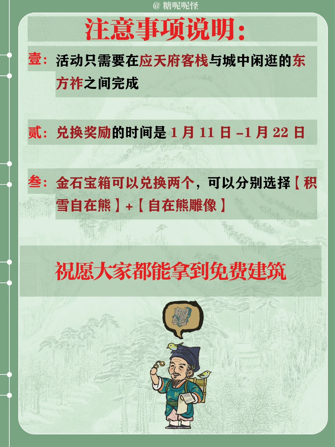 [一R]活动只需要在应天府客栈与城中闲逛的东方祚之间完成 [二R] 兑换奖励的时间是1月11日-1月22日 [三R] 金石宝箱可以兑换两个,可以分别选择【积雪自在熊】+【自在熊雕像】