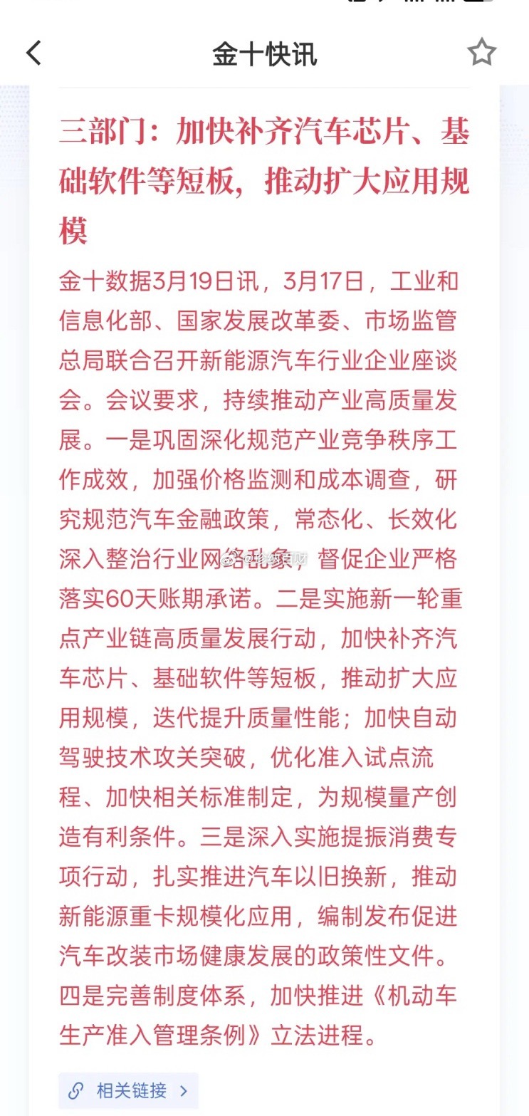 利好消息,三部门:加快补齐汽车芯片、基础软件等短板,推动扩大应用规模,主要是要,推动自动驾驶快速商用落地,我国在快速发展自动驾驶技术以及智能驾驶技术,车规芯片,尤其是接下来的智能自动驾驶技术的芯片,要求更高。我以把这些汽车芯片的短板补齐,尤其是基础软件的短板补齐,那自然这些技术将来就会变得更成熟!现在的汽车行业已经成为我国支柱产业链!中国的汽车品牌将逐步的推向海外市场,成为重要的汽车品牌!委内瑞拉击败美国夺冠 全国放假一天