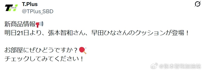 日本乒乓球t联赛张本智和 260319 T联赛卖张本智和靠垫。“新品信息📢从明天起,张本智和、早田希娜的靠垫即将登场!摆在房间里感觉怎么样?🏓请去看看吧!”(机翻)Cr: T.PLUS