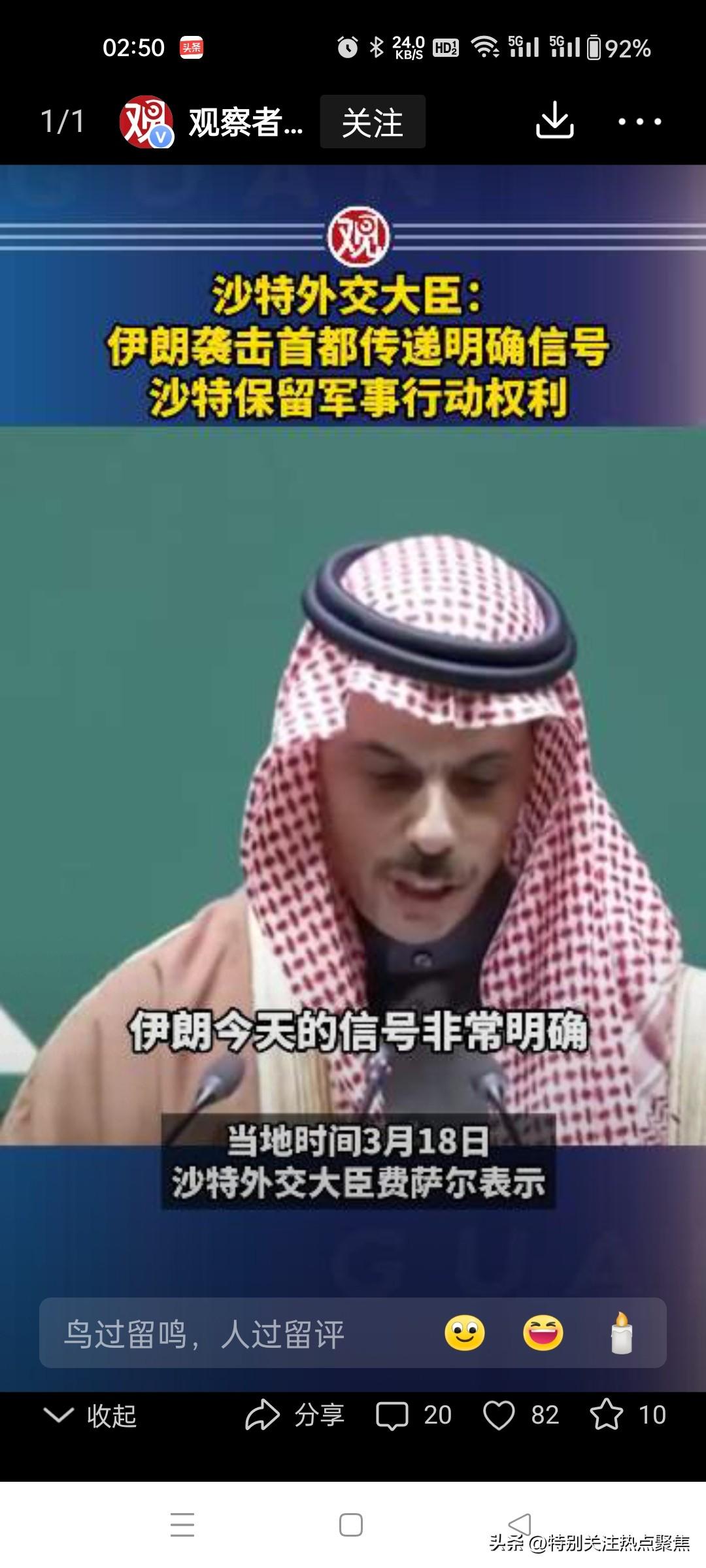 沙特外交大臣:伊朗袭击首都释放明确信号,沙特保留军事行动权 伊朗今日所释放的信号极为明确,其行为属于“蓄意挑衅”。 沙特外交大臣费萨尔·本·法尔汉就伊朗袭击利雅得发表强硬声明,明确指责伊朗此举是“蓄意挑衅”,并宣称沙特保留采取军事行动的权利。 事件定性与时机:沙特方面认为,伊朗在 12 国外长齐聚利雅得商讨地区和平之时发动导弹袭击,并非偶然,而是向地区外交释放了“最明确的敌对信号”,意在破坏谈判并向邻国施压。袭击发生在多国代表开会期间,被视作对正在进行的斡旋努力的直接打击。 核心立场与警告:费萨尔强调,沙特不会屈服于压力或恐吓,这种胁迫行为只会适得其反。他明确表示:“我们保留在必要时采取军事行动的权利”,并警告伊朗其行为必将产生后果,一旦时机成熟,沙特领导层将做出必要决定。 信任破裂与后续影响:沙特外交大臣指出,伊朗的袭击表明其长期依靠支持代理人攻击邻国的策略,这已“彻底摧毁”了双方仅存的信任,重建关系将耗时良久。此次冲突致使油价飙升,若沙特真的实施军事反击,可能引发海湾国家与伊朗的直接对抗,甚至招致美国更大程度的介入。 风险提示:当前中东局势高度紧张,各方表态强硬,存在冲突进一步升级及外溢的风险,相关军事行动的可能性需密切关注官方后续动态。