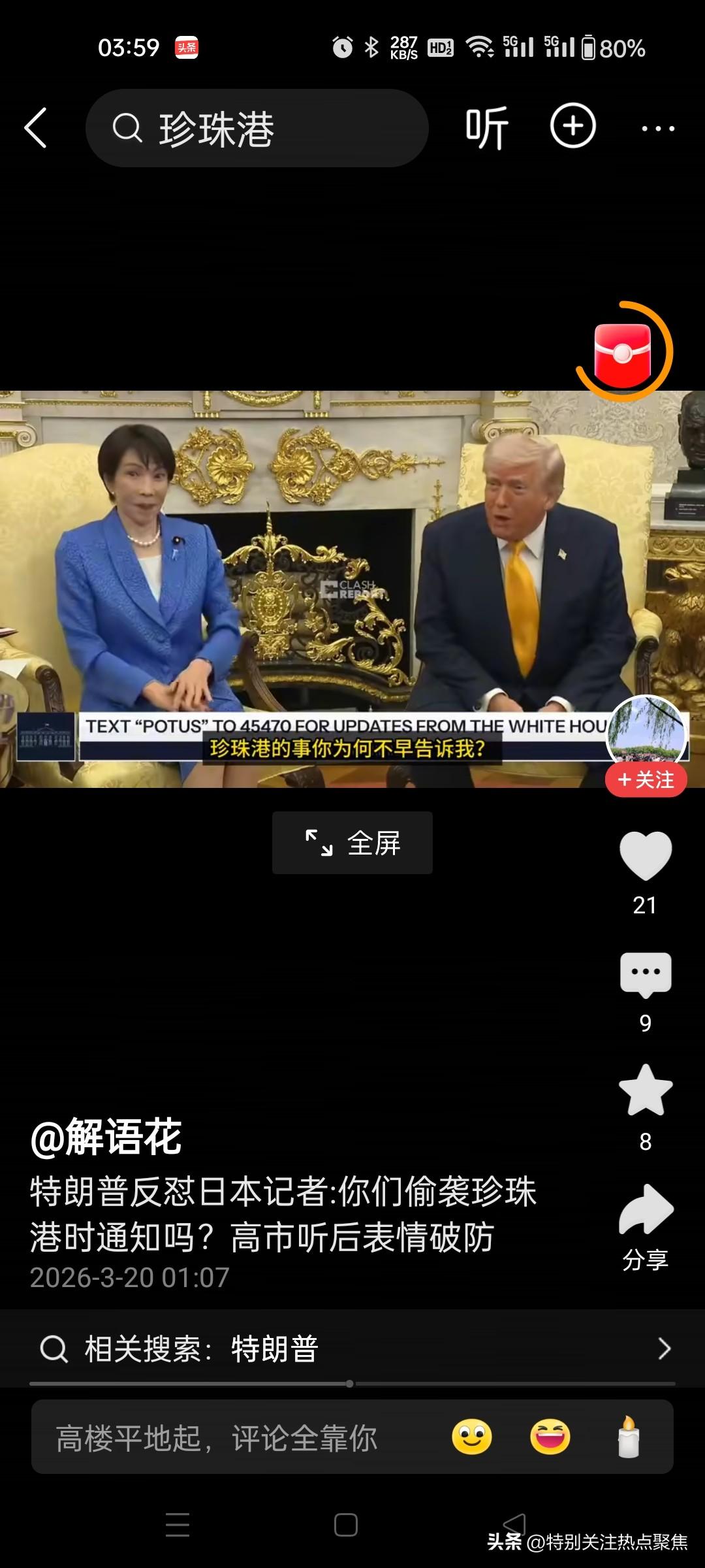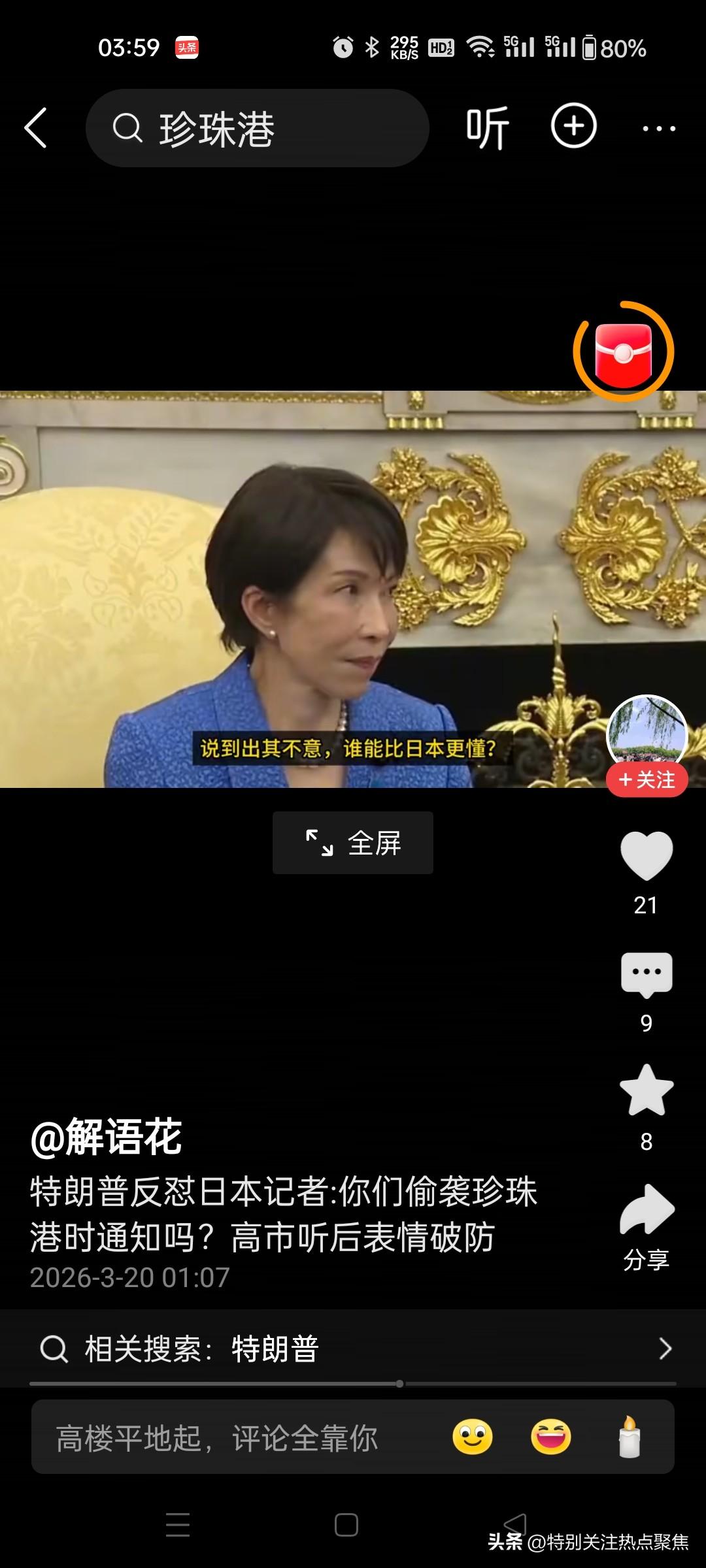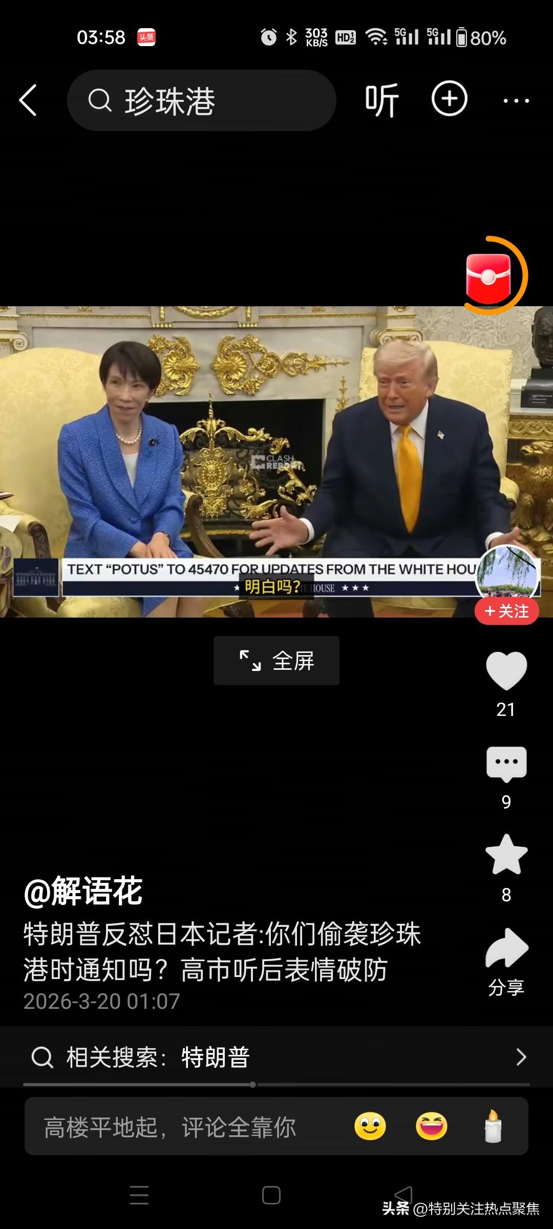 高市早苗高囧时刻,被特朗普在白宫挖苦精准戳痛处,阴阳怪气拉满,哈哈,这绝对是大型社死现场,她肯定听懂了,而且是尴尬到抠出三室一厅的程度! 从现场画面看,高市早苗当时的表情管理已经完全失控: - 嘴角僵硬地维持着职业假笑,眼神却在疯狂漂移,不敢直视特朗普。 - 身体微微僵硬,甚至下意识地耸肩、低头,试图用肢体语言掩饰内心的崩溃。 这就好比你去朋友家做客,朋友当着众人的面,突然揭你祖上最不光彩的黑历史,你还得陪着笑脸说“您说得对”。 特朗普这波操作堪称外交降维打击: 1. 精准戳痛处:直接拿日本二战最敏感的“偷袭珍珠港”说事,把日本的“黑历史”当成美国突袭伊朗的“正面教材”。 2. 阴阳怪气拉满:言外之意就是“偷袭这门手艺,你们是祖师爷,我只是学你们的”,让高市早苗根本没法反驳。 3. 盟友变笑柄:当着全世界记者的面,把亲密盟友的历史伤疤扒出来当段子讲,高市早苗除了尬笑,别无选择。 所以,她不是听不懂,是听懂了但不敢怒、不敢言,只能硬着头皮尬住,脚趾头估计已经把白宫地板抠穿了。😂