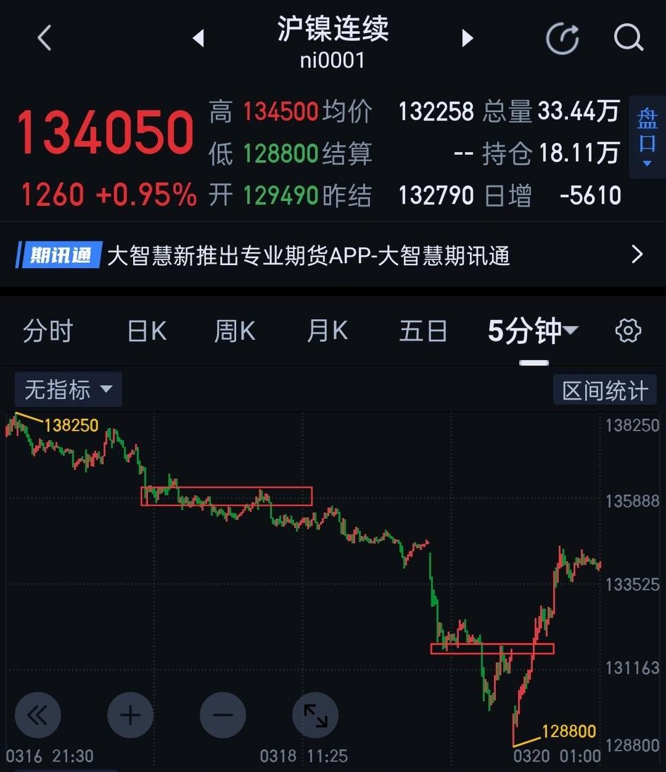 沪镍,能否向下形成有效突破,尚有变数。 夜盘(图2)形成背驰后,快速向上反弹。日盘能否有效站稳图(2)第二个中枢是关键。站稳,从128800开始的三十分钟一笔上有望继续生长,不排除接触图(3)135340,从而生长成更大级别中枢。若不能站稳图(2)第二个中枢,则可能围绕该中枢,形成更大级别的震荡。 沪镍在此位置一味看多、看空都要慎重。一定要伺机而动,见机行事。