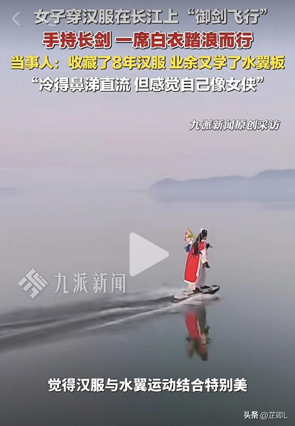 古装女侠在长江上御剑飞行?!武汉女子汉服踏浪长江,引爆网络!网友:又仙又飒,绝美! 武汉一位小姐姐最近直接火出圈!别人穿汉服是拍照打卡,她直接脚踩水翼板,在长江上玩起了“御剑飞行”,衣袂飘飘乘风破浪,画面又仙又飒,看呆无数网友。 这位小姐姐,妥妥的国风爱好者,痴迷汉服整整8年,家里收藏了五六十套,绝对的大户人家。 三年前她又迷上了水翼板,突发奇想把汉服和运动结合,没想到效果直接拉满。 为了拍出绝美画面,她简直拼了!经常凌晨四点就起床,拉着朋友直奔江边。长江、汉江、月湖到处都留下她的身影。 造型更是不重样,雪山飞狐、江湖女侠、小哪吒,各种角色轻松拿捏。 别看视频里潇洒帅气,现实中可是冻得够呛。近期江面温度不到10度,江风一吹脸发麻,鼻涕直流,手套都要戴两双。但小姐姐完全不在乎,直言享受江上飘着的感觉,像大侠入定一样自在。 视频爆火后,网友纷纷点赞,夸她又美又敢,把汉服穿出了新高度。 也有不少热心网友在线叮嘱,一定要做好防护,穿好救生衣,安全才是第一位。 又酷又美的国风浪尖女侠,这波操作谁看了不得在心里说一句:羡慕嫉妒! 近些年来,随着传统文化的复兴,汉服也越来越多地走进普通人的生活。而各个旅游景区,更是争着把汉服玩出新高地! 这种文化回归,对于一个民族来说,真的是一件顶好顶好的事。 对比汉服,我更钟爱新中式,它简洁、方便又不失传统汉服的韵味。作为日常穿着服饰,一点也不违和。 作为新中式的爱好者,我的衣橱里,新中式的比重逐年增加。 你也喜欢和穿着汉服吗?一起来评论区聊聊! 素材来源:九派新闻,侵联删!