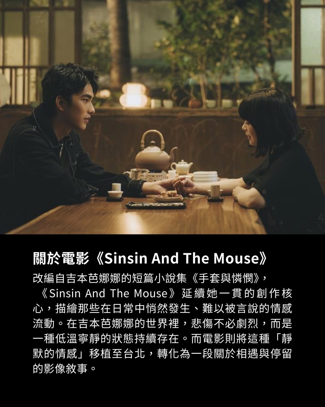 曾敬骅与岸井雪乃主演电影6月日本上映,电影《Sinsin And The Mouse》改编自吉本芭娜娜短篇小说《手套与怜悯》。
