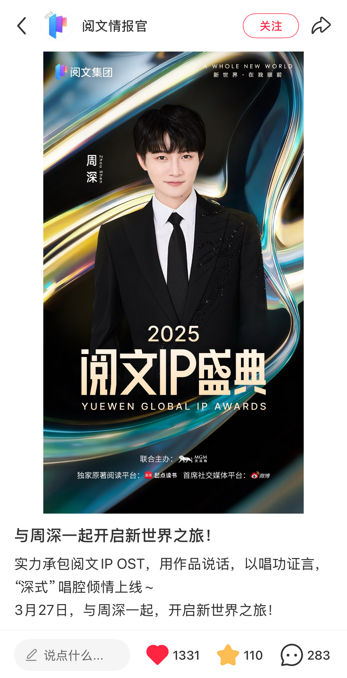 周深 📣3.20 阅文IP盛典官宣单人物料 📣米子们多三连‼️不要空瓶文案
