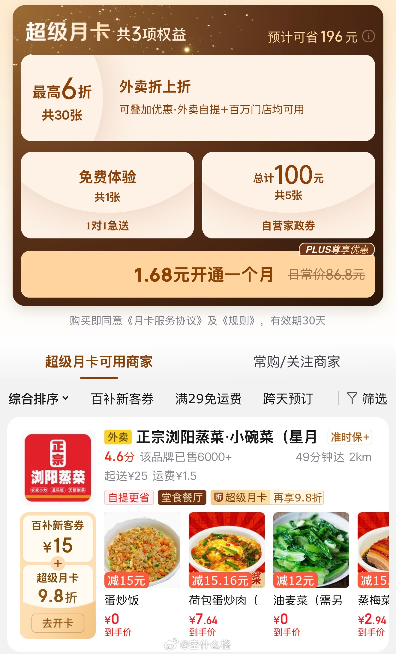 京东外卖超级月卡,仅需1.68元一单就轻松回本:网页链接