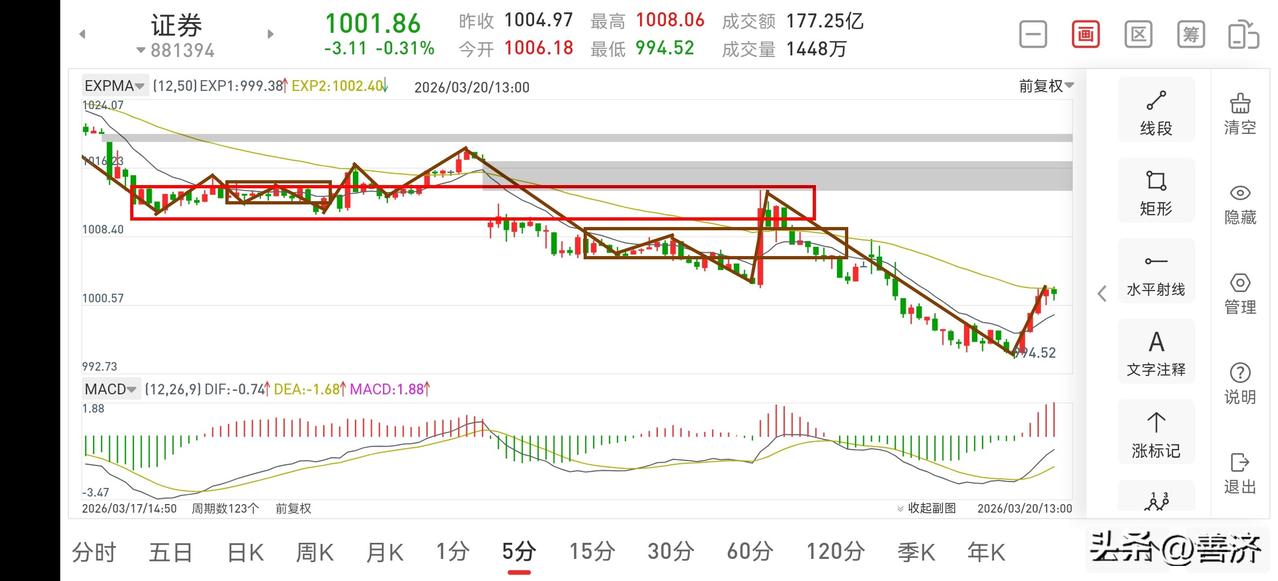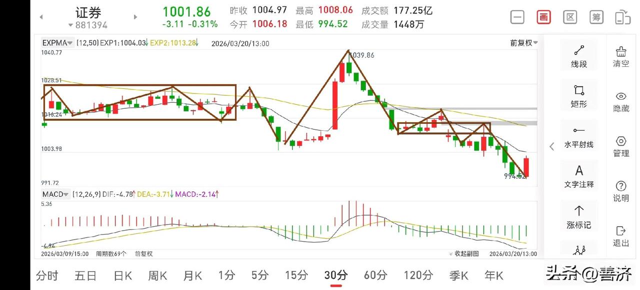 聊聊证券板块(2026.3.20) 今天证券板块早盘略微冲高后随后逐步回落,回落力度较强,虽临近上午收盘有所收复,但短期难以改变它的下跌趋势,因此,后面预期还有5个点左右的下跌空间,操作上仍然以半成仓位观察为主。 1.从30分钟图一上看,目前正在走中枢的离开段,这个离开段还没有5分钟中枢,所以它的离开段远没有走结束,还是那句话,耐心等待大阴线到来。 2.从5分钟图二上看,此处虽有反弹,那也是对30分钟中枢的完善或者形成5分钟二卖的过程,真正的下挫还在后面,所以此处是要管住手的,切不可操之过急。 3.商业航天妖龙反弹还没有走结束,耐心等待10个点以上的大阳线出来后可考虑减轻一点仓位。 总之,证券板块大阴线没出来之前就是管住手,耐心等待它的最后一跌。