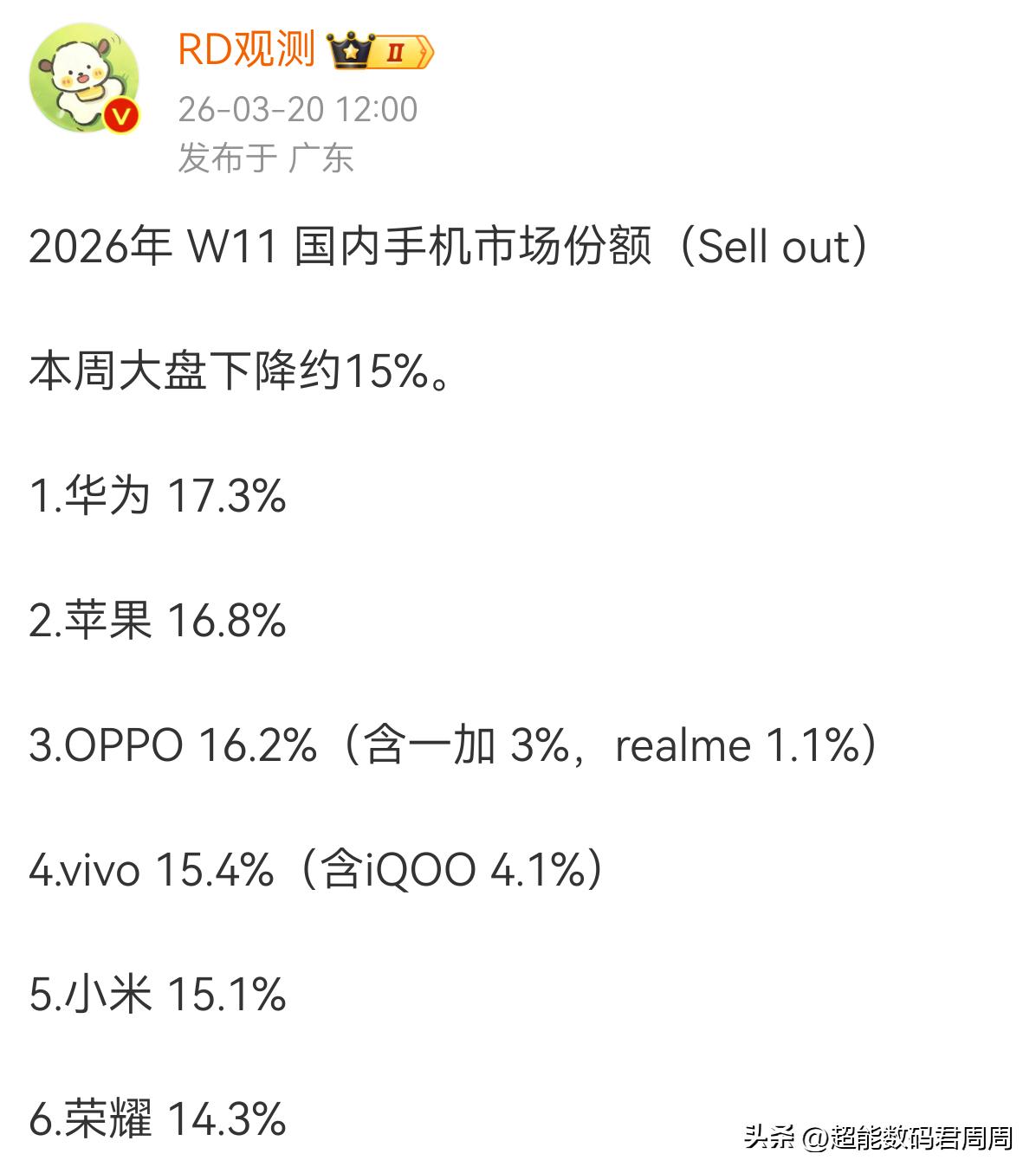 华为继续领跑周数据榜单,三个梯队还是很稳定的,华为和苹果,OPPO和vivo,荣耀和小米。很多人在为小米和荣耀的份额而发愁,我觉得没有必要,因为我相信广大米粉会在6.18前后会真金白银助力份额的提升;至于荣耀嘛更不用担心了,作为深圳GZW唯一盈利的企业,它只要把国内的份额稳住就行,这不子品牌和海外布局海外提提速。