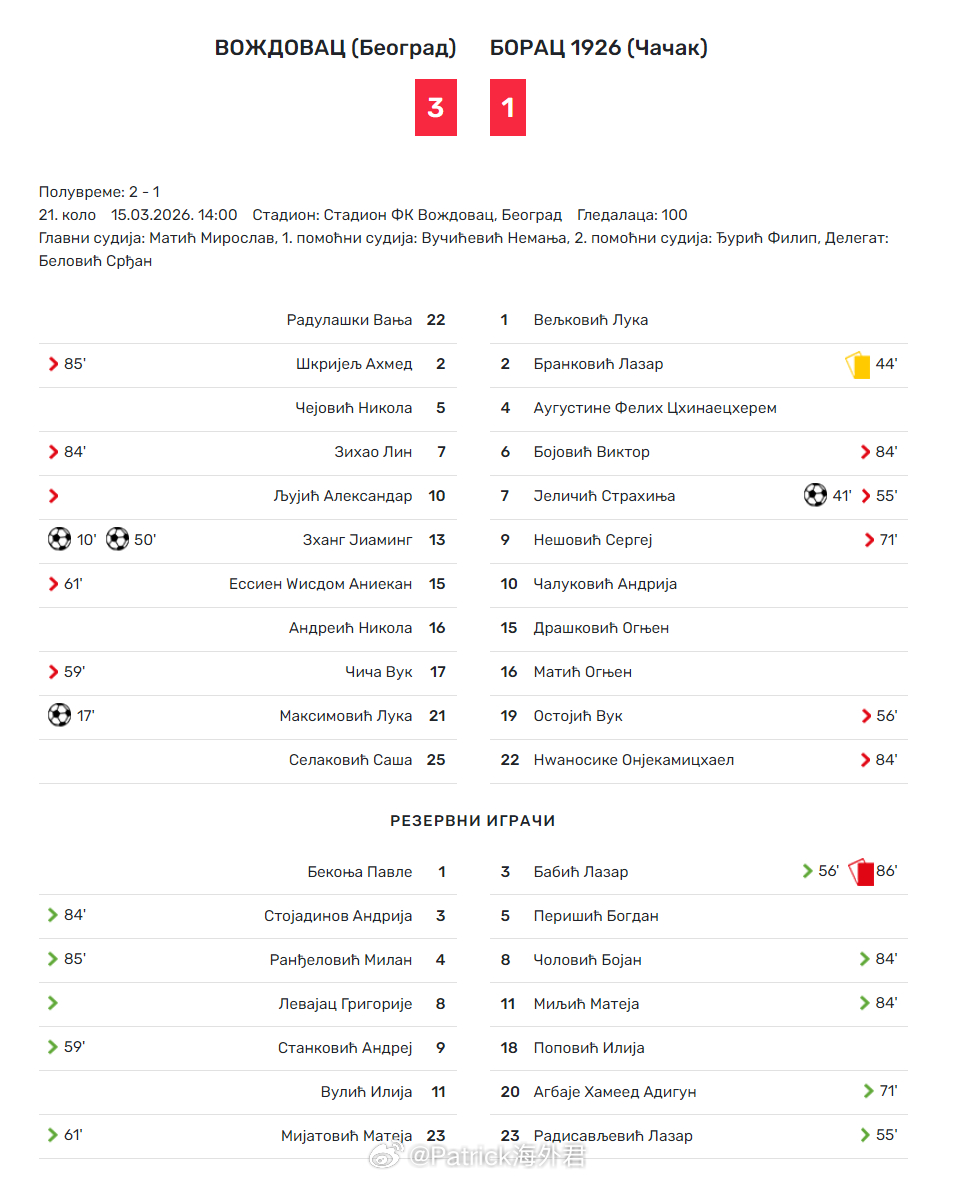 张家鸣 梅开二度。塞尔维亚U19全国联赛(1)第22轮,沃日多瓦茨在主场3比1战胜垫底球队博拉茨1926,林子皓(07)、张家鸣(07)首发出战,张家鸣上演梅开二度。