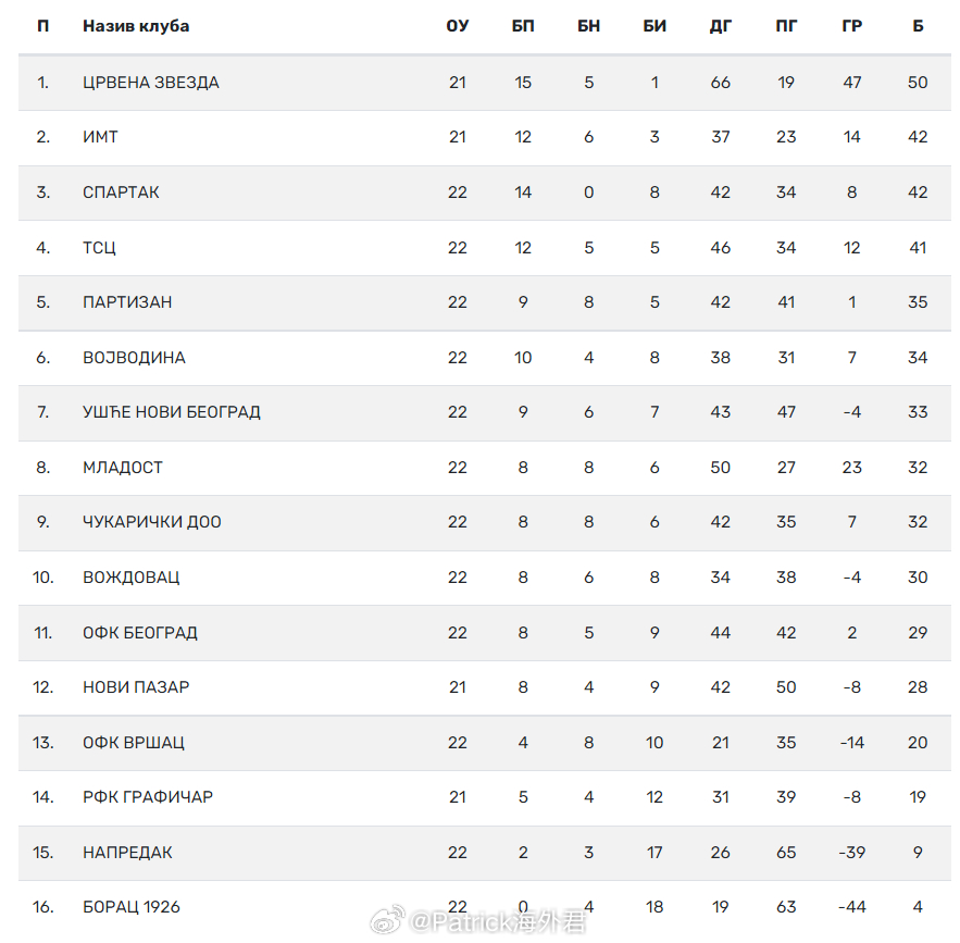 22轮战罢,沃日多瓦茨积26分暂列积分榜第10位,下轮联赛将于4月4日进行。